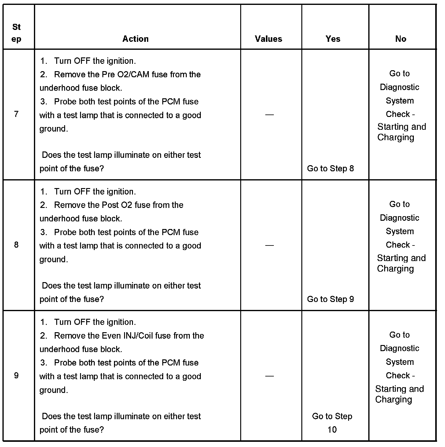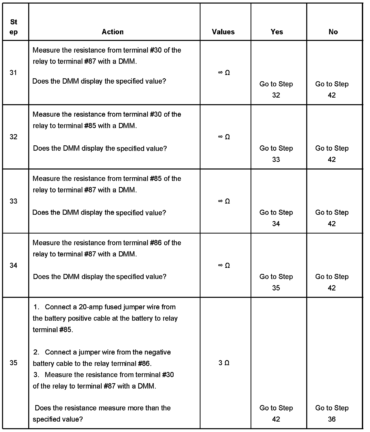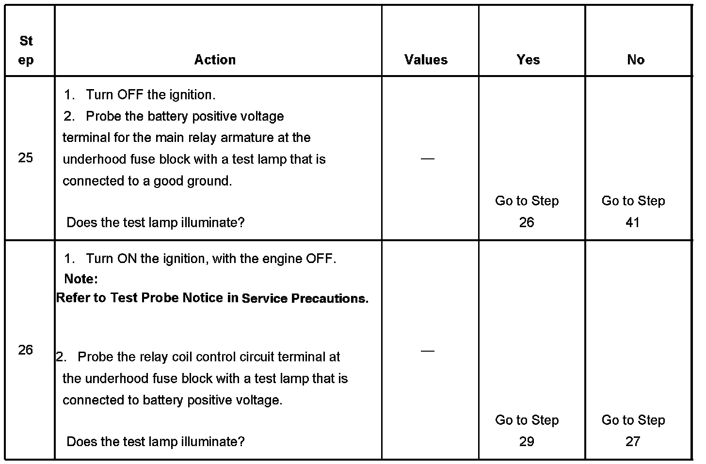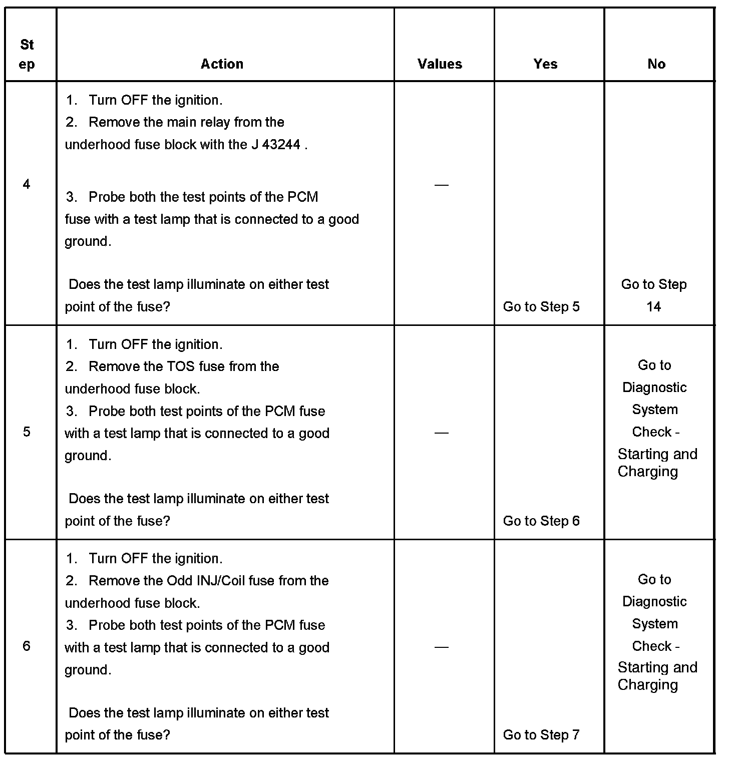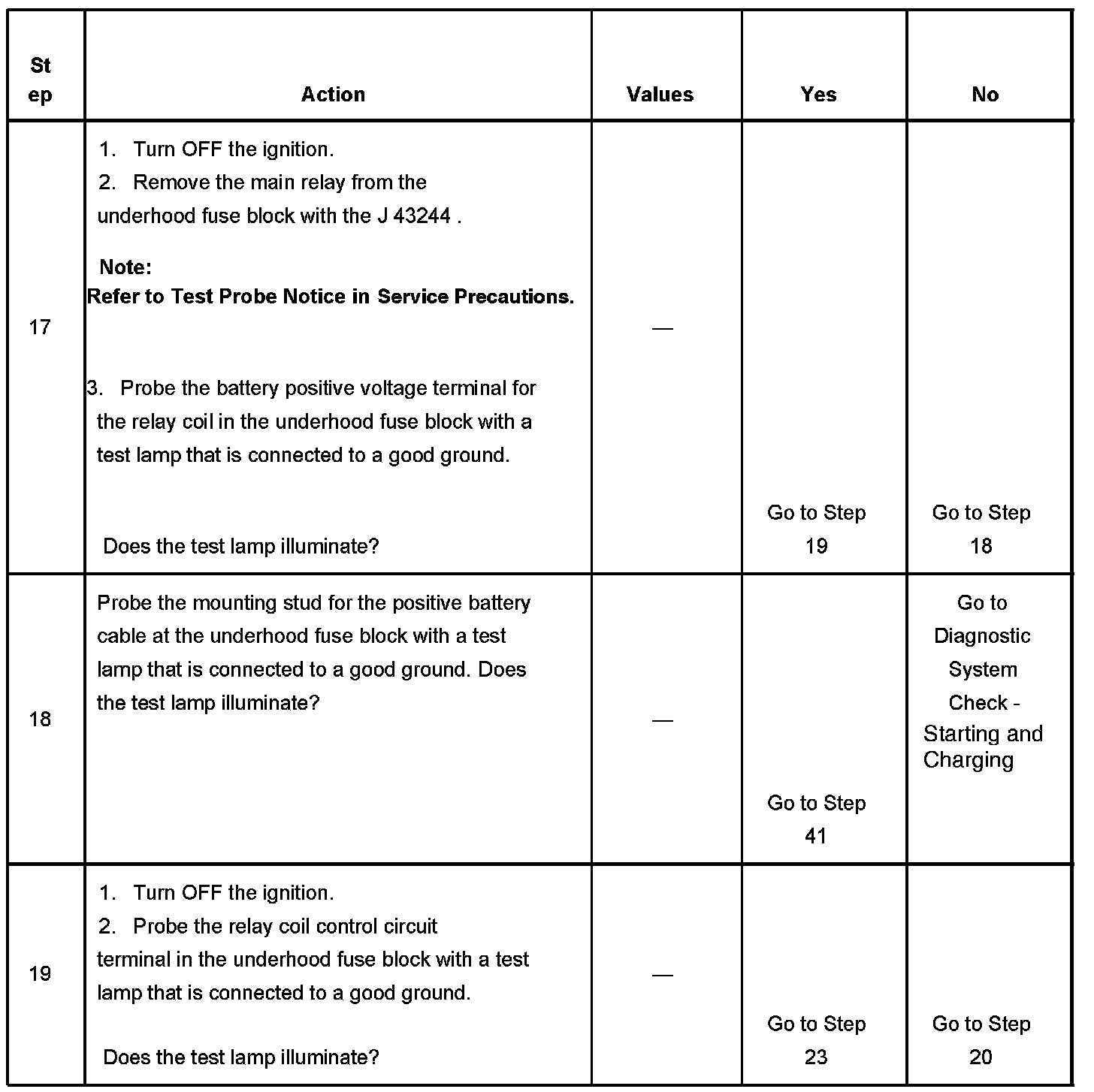 If the main relay fails to close the engine will crank, but will not run. The PCM class 2 communications will be available with the use of a scan tool. The main relay system diagnosis table assumes that the vehicle battery if fully charged. Refer to Battery Inspection/Test in Starting and Charging. Battery Inspection/Test