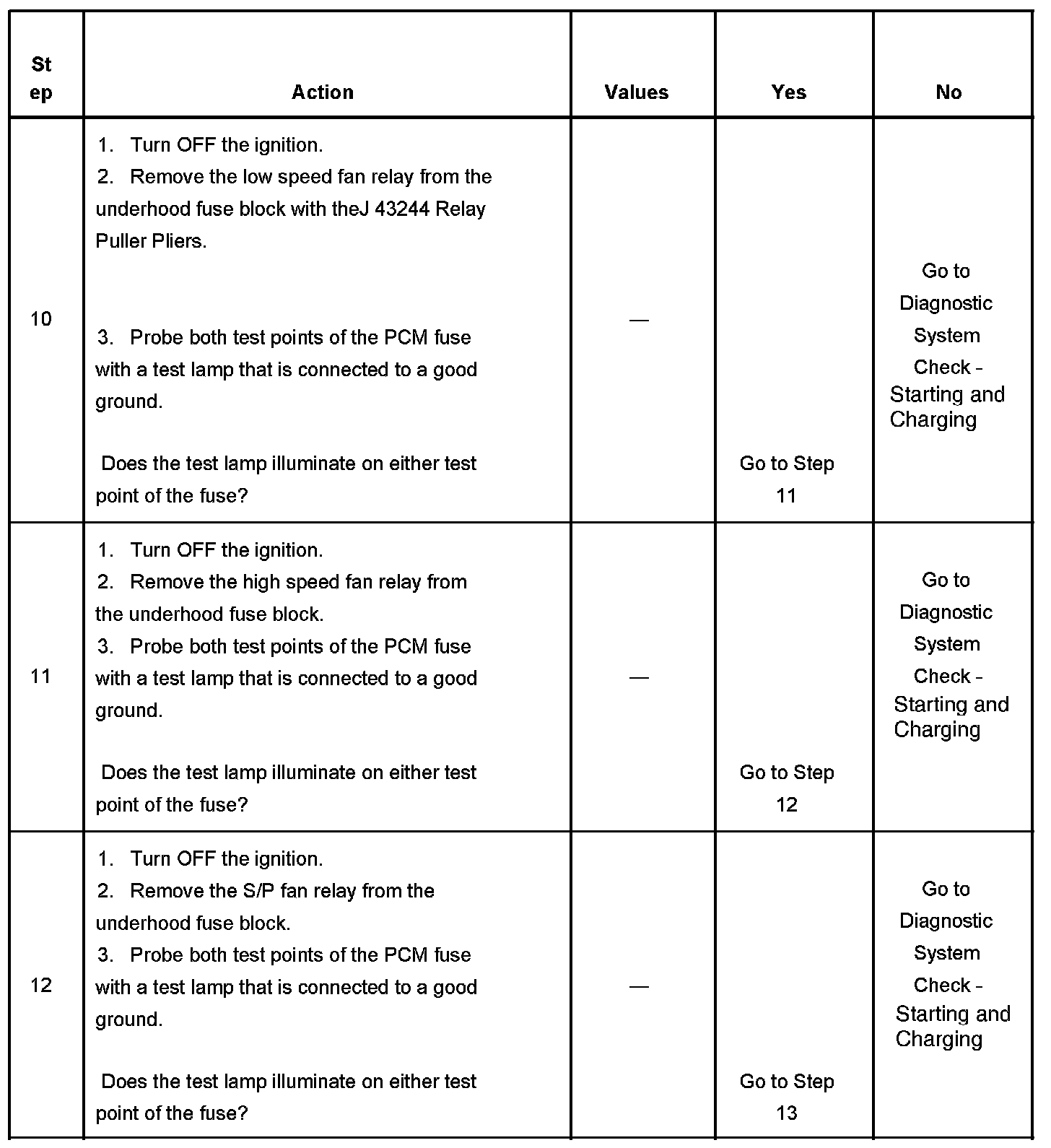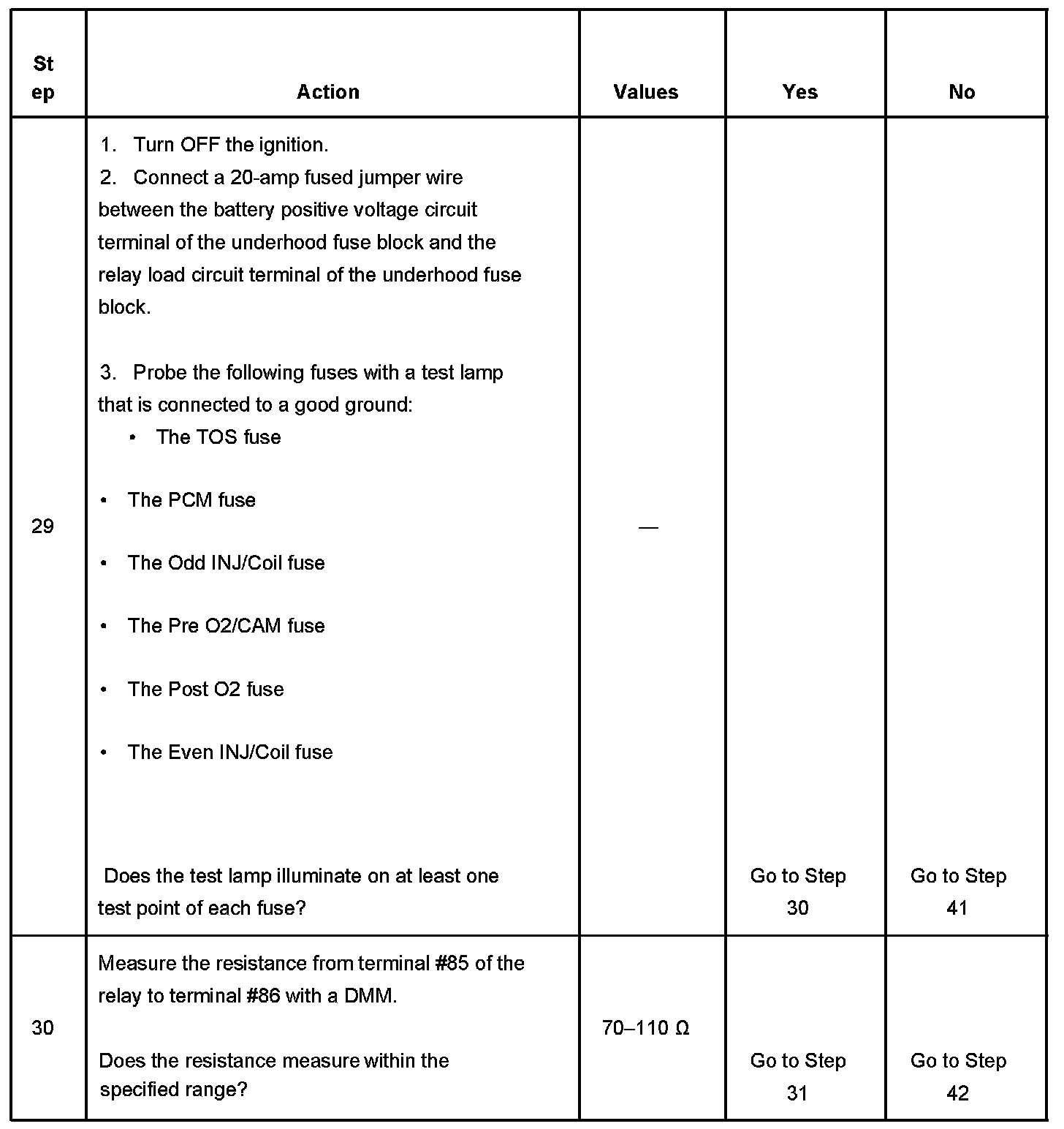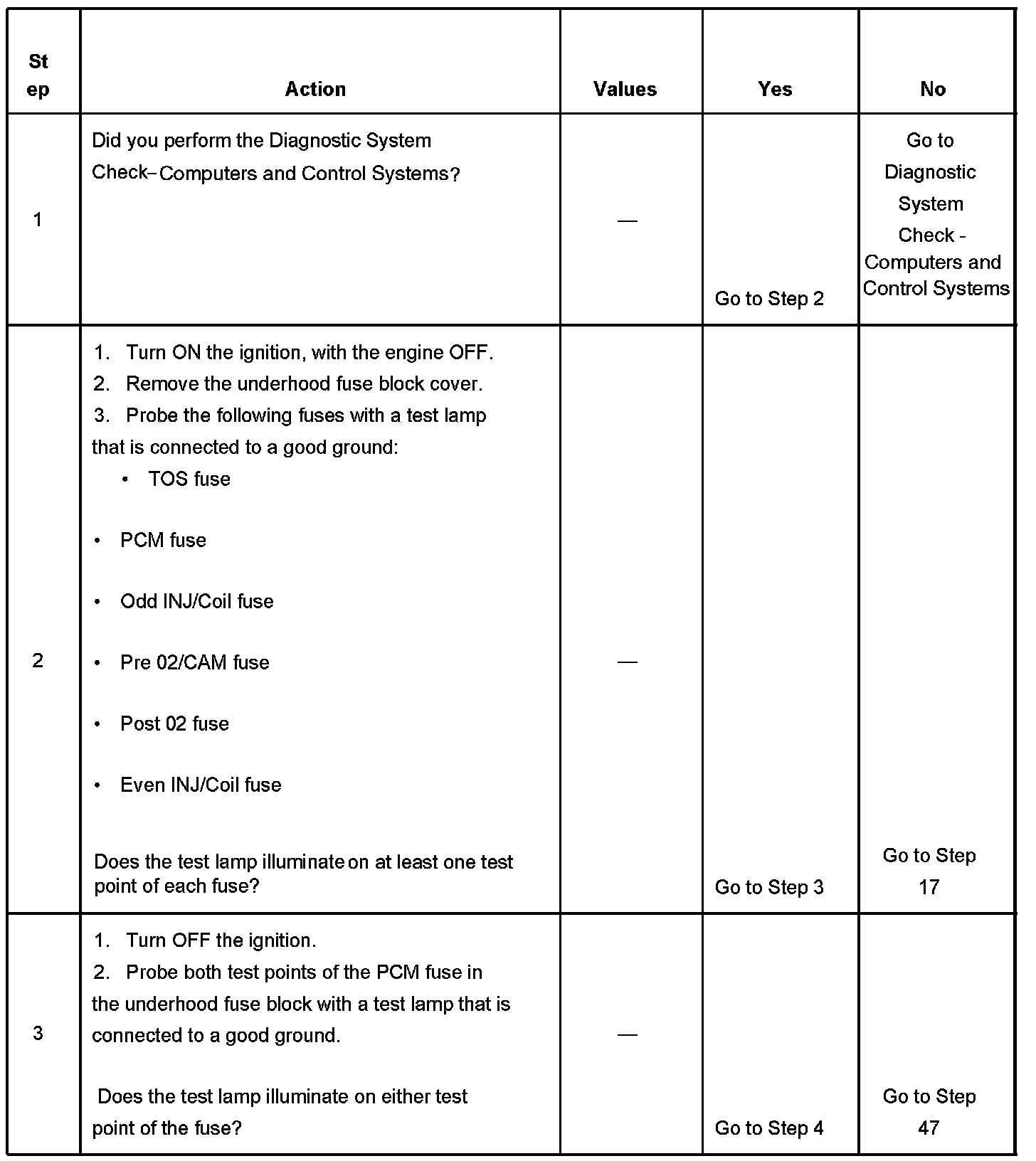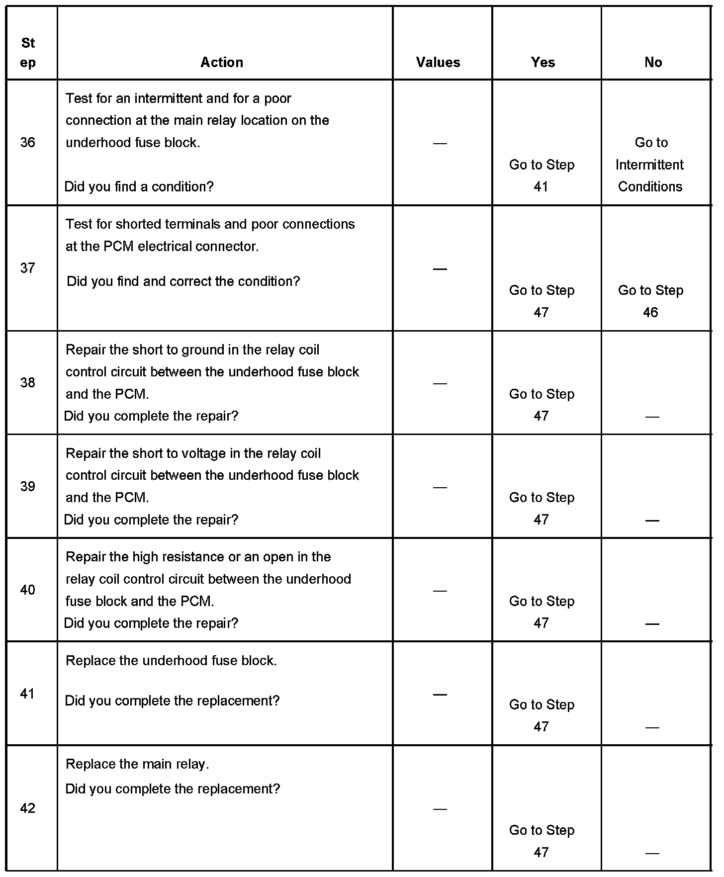 If the main relay fails to close the engine will crank, but will not run. The PCM class 2 communications will be available with the use of a scan tool. The main relay system diagnosis table assumes that the vehicle battery if fully charged. Refer to Battery Inspection/Test in Starting and Charging. Battery Inspection/Test