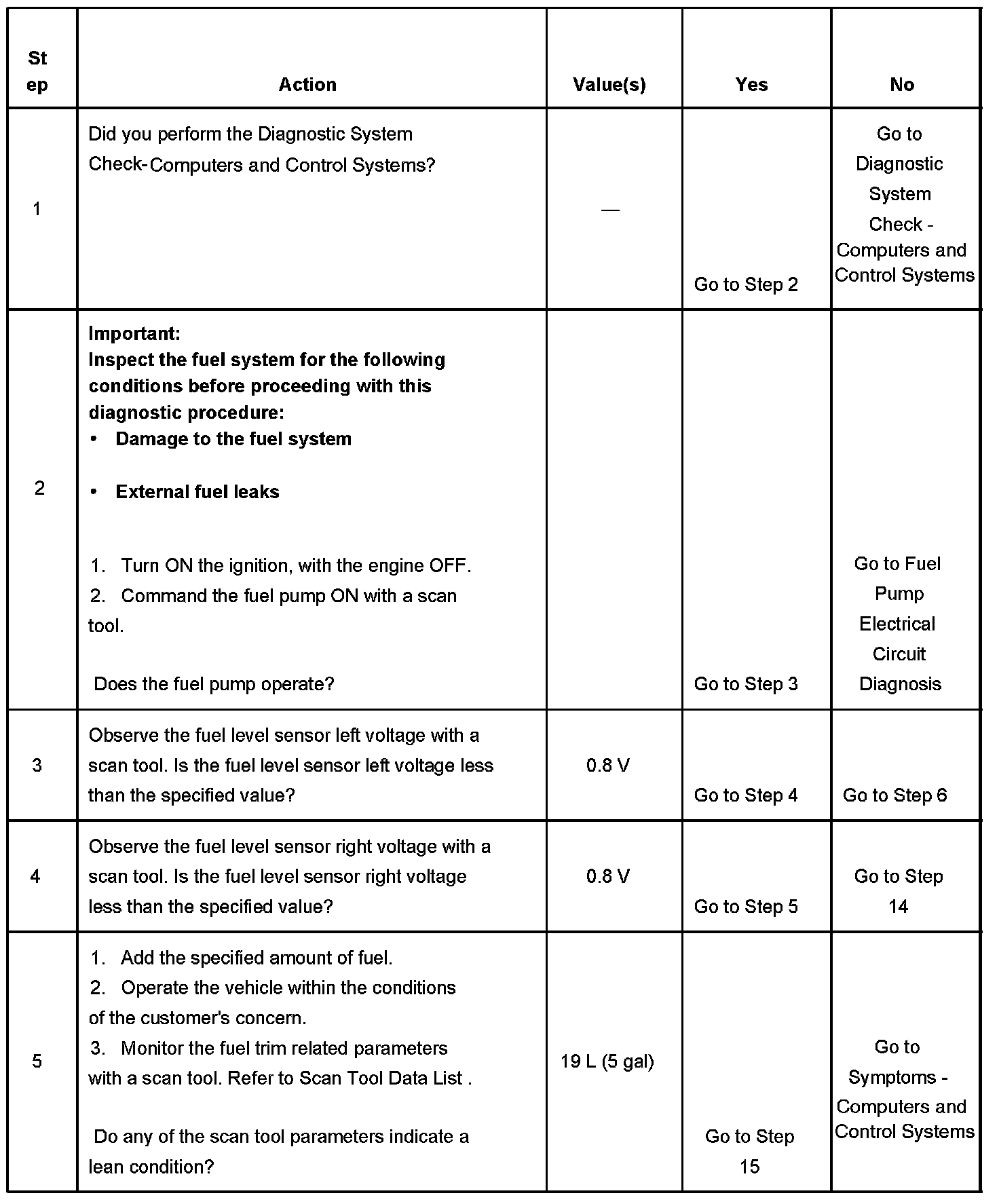 4. This step verifies that the vehicle is not out of fuel. If the right fuel sender is below 0.8 volt, and the left fuel sender is above 0.8 volt, a fuel transfer condition exists.