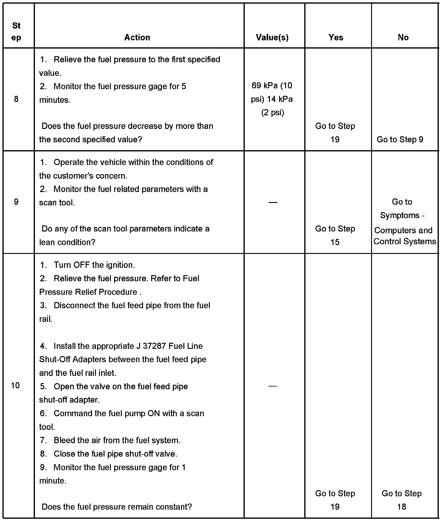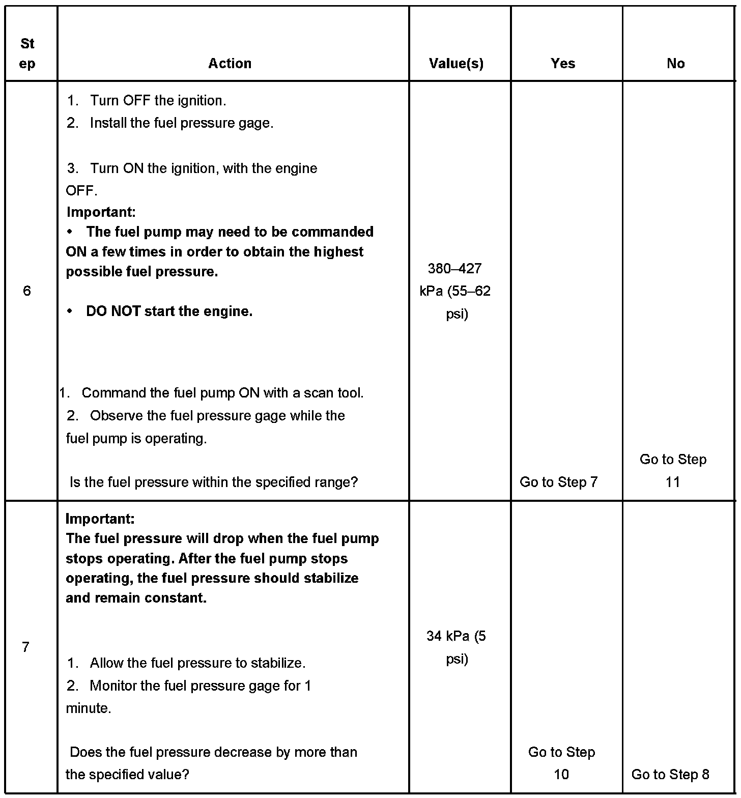 7. This step tests for an internal fuel leak. If the fuel pressure drops during this test, then an internal loss of pressure is indicated.
