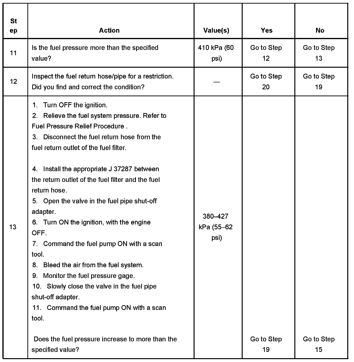 13. This step isolates the condition. Replace the primary fuel tank module assembly for a stuck open or leaking fuel pressure regulator, if the fuel pressure increases above the specified value.