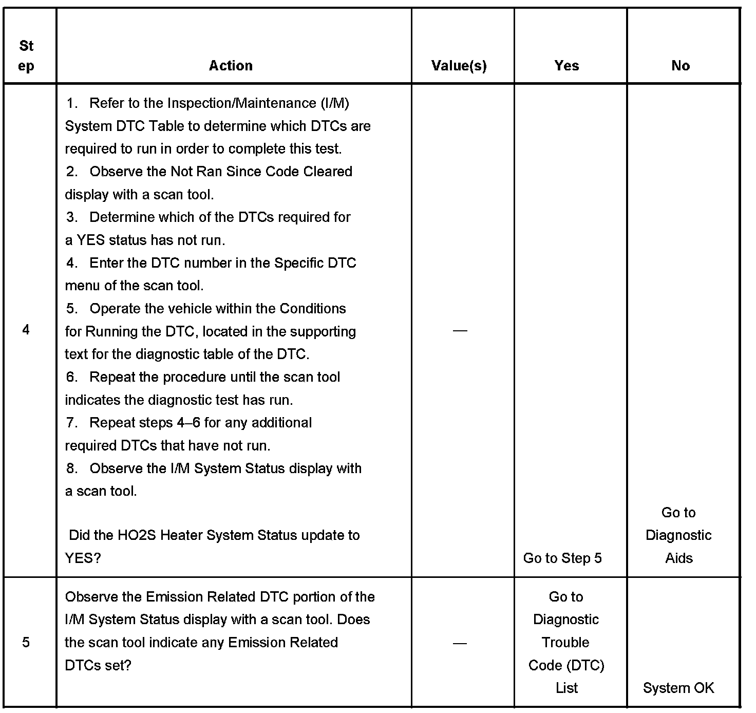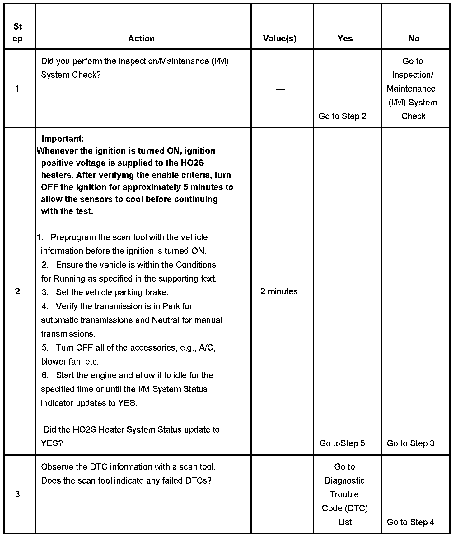 The purpose of this test is to satisfy the enable criteria necessary to execute inspection/maintenance (I/M) readiness diagnostics for the heated oxygen sensor (HO2S) system. The test may be used to set the I/M System Status to YES. The I/M System Status display on the scan tool provides an indication of whether the control module has completed the required tests. The I/M System Status does not indicate that the tests have passed or failed. When all of the diagnostics for a specific system have run and passed, the I/M System Status will update to YES. If a test for a specific system has failed, the I/M System Status will update to YES, indicating a determination was made, even if all of the other tests for that system have not run.