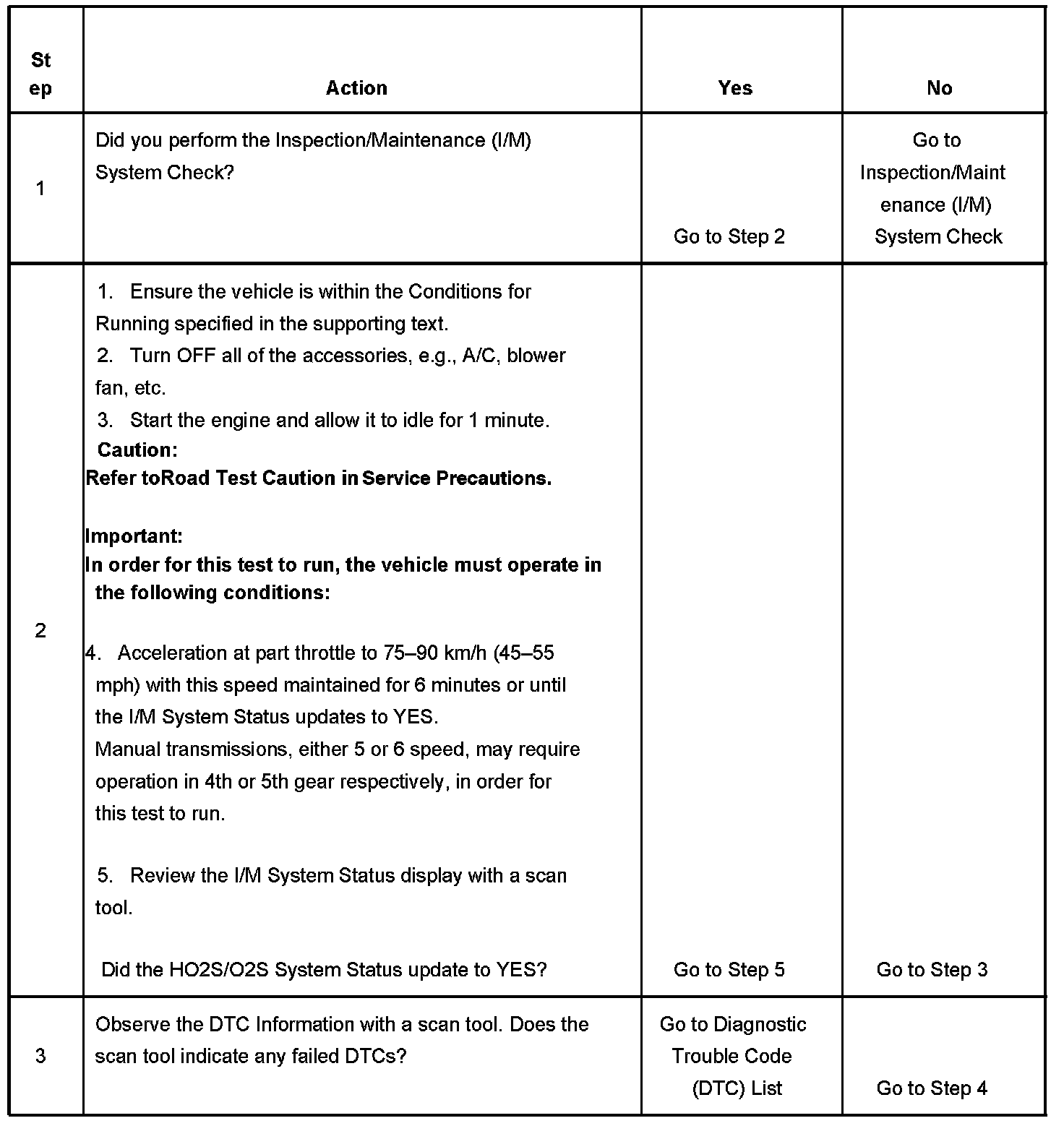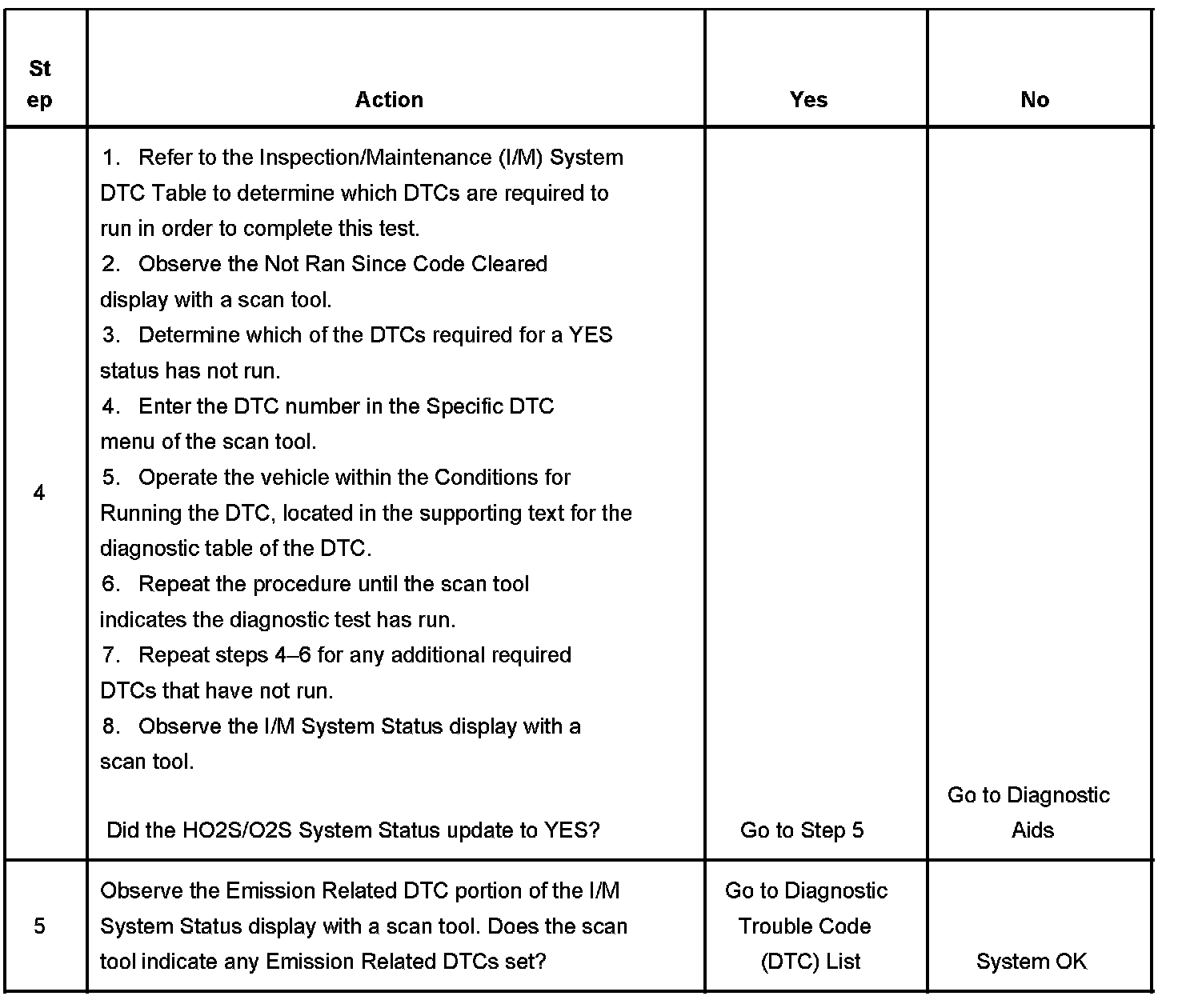 The purpose of this test is to satisfy the enable criteria necessary to execute I/M readiness diagnostics for the oxygen sensor (O2S, HO2S) system. The test may be used to set the I/M System Status to YES. The I/M System Status display on the scan tool provides an indication of whether the control module has completed the required tests. The I/M System Status does not indicate that the tests have passed or failed. When all of the diagnostics for a specific system have run and passed, the I/M System Status will update to YES. If a test for a specific system has failed, the I/M System Status will update to YES, indicating a determination was made, even if all of the other tests for that system have not run.
