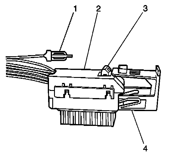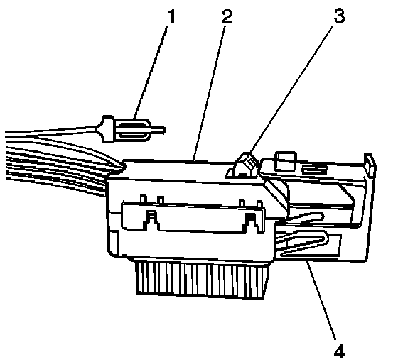 3. Remove the connector position assurance (CPA) (1) from the wiring harness connector (2) to the inflatable restraint sensing and diagnostic module (SDM).