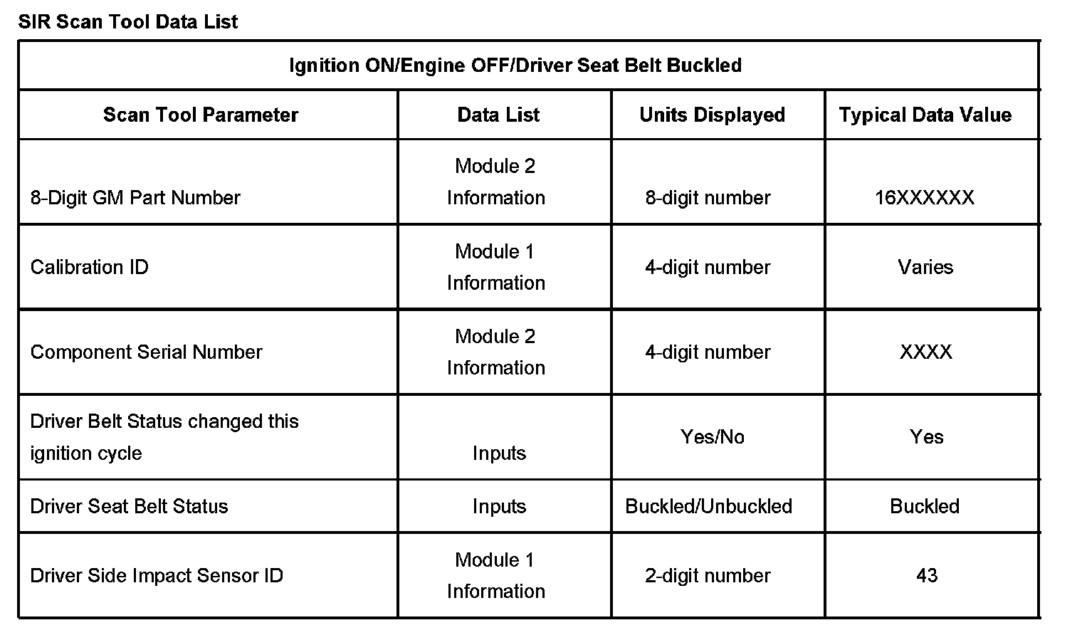 The SIR Scan Tool Data List contains all the restraint system related parameters that are available on the scan tool. The parameters in the list are arranged in alphabetical order. The column, "Data List," indicates the location of the parameter within the scan tool menu selections.