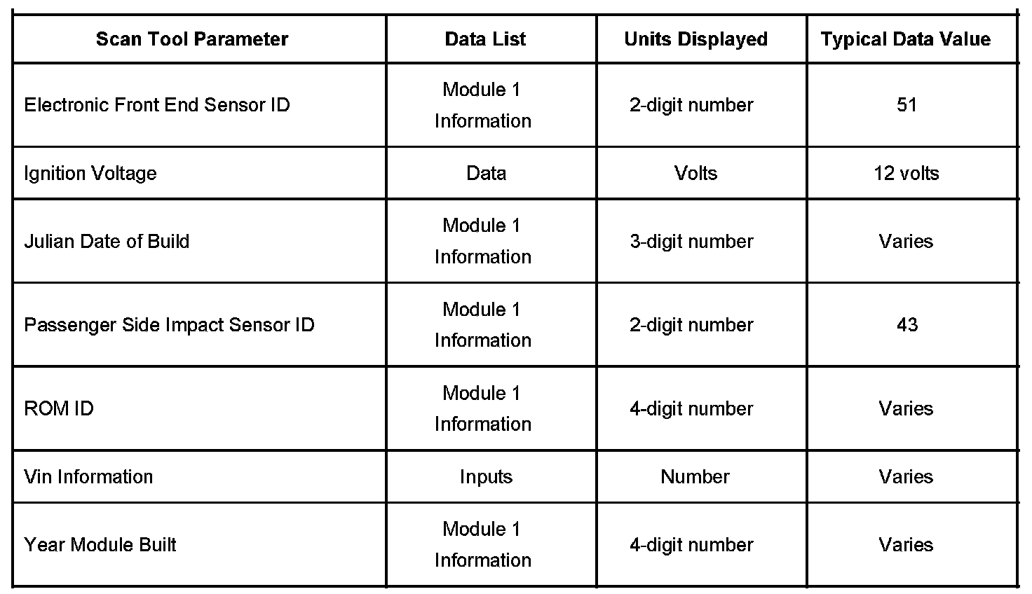 The Typical Data Values are obtained from a properly operating vehicle under the conditions specified in the first row of the Scan Tool Data List table. Comparison of the parameter values from the suspect vehicle with the Typical Data Values may reveal the source of the customer concern.