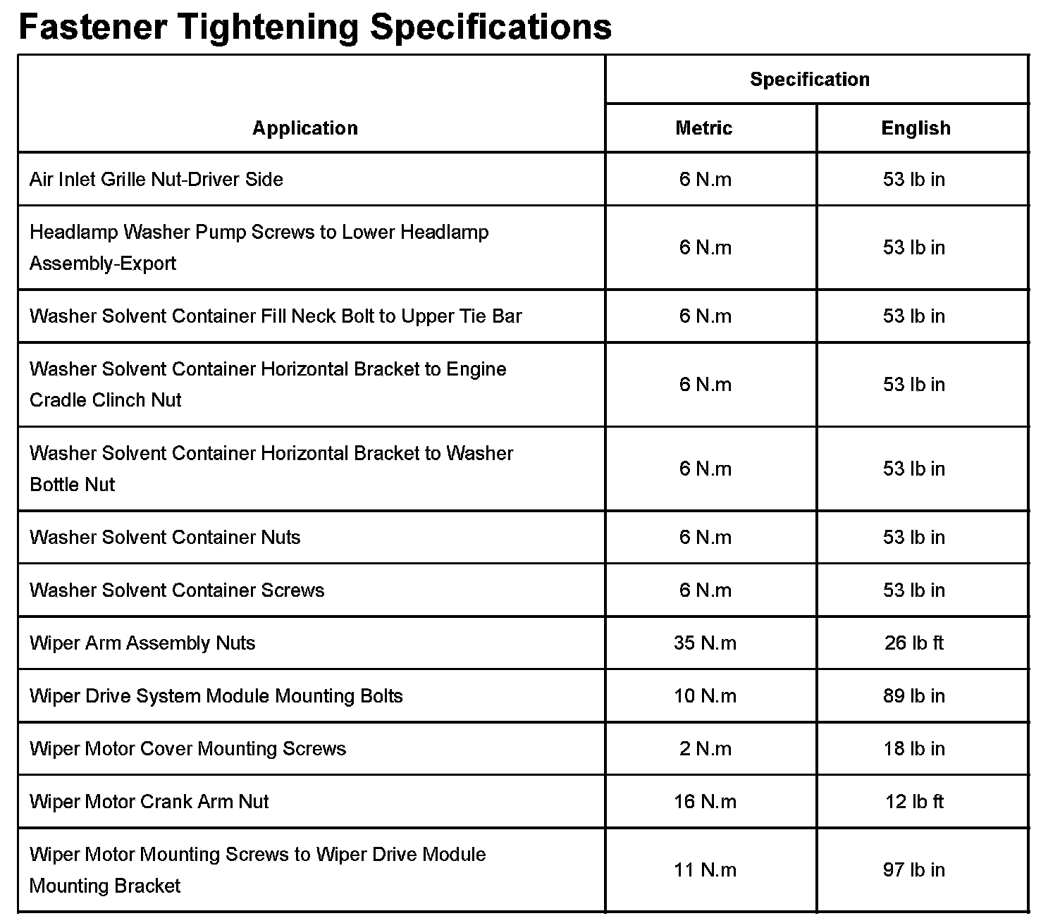 Wiper and Washer Systems: Specifications