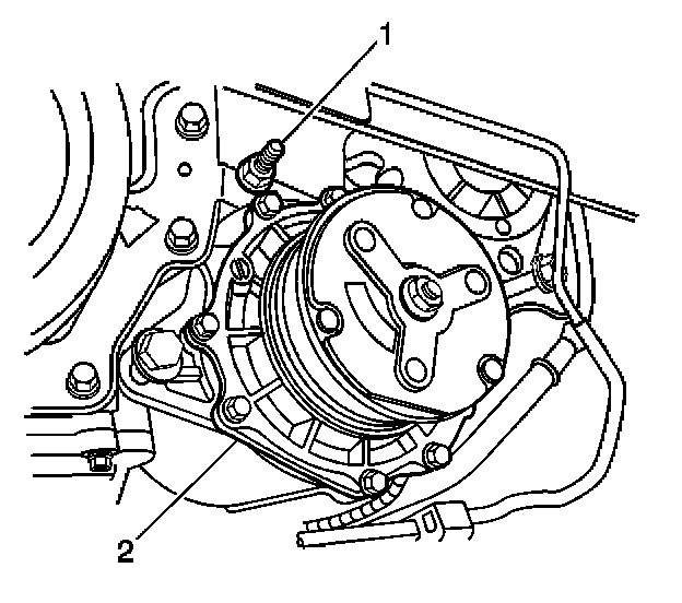 11. Install the discharge hose nut (2) to the compressor.