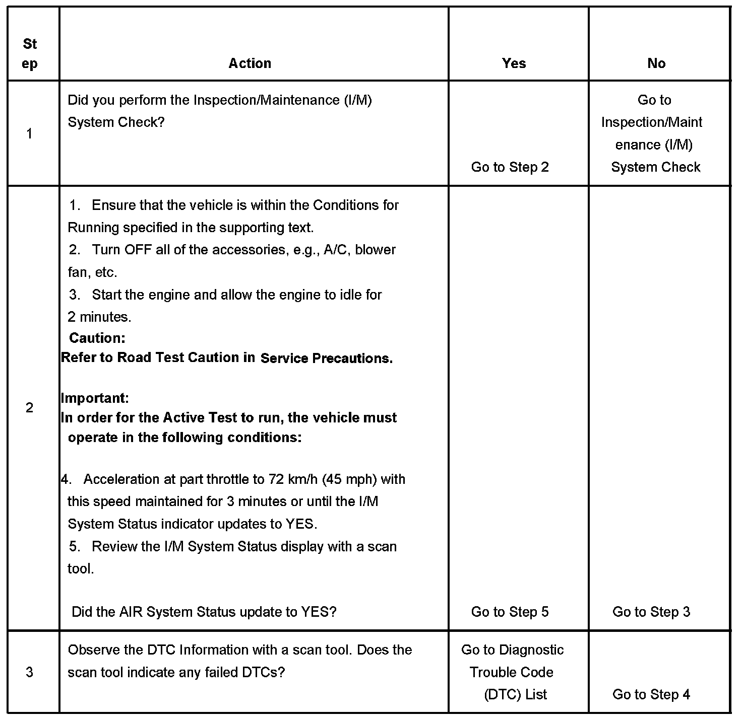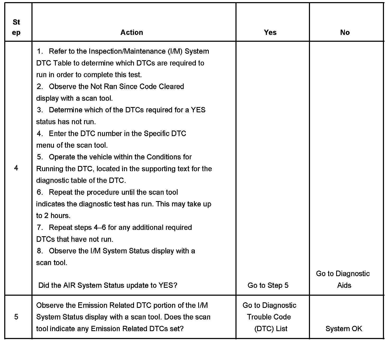 The purpose of this test is to satisfy the enable criteria necessary to execute inspection/maintenance (I/M) readiness diagnostics for the secondary air injection (AIR) system. The test may be used to set the I/M System Status to YES. The I/M System Status display on the scan tool provides an indication of whether the control module has completed the required tests. The I/M System Status does not indicate that the tests have passed or failed. When all of the diagnostics for a specific system have run and passed, the I/M System Status will update to YES. If a test for a specific system has failed, the I/M System Status will update to YES, indicating a determination was made, even if all of the other tests for that system have not run.