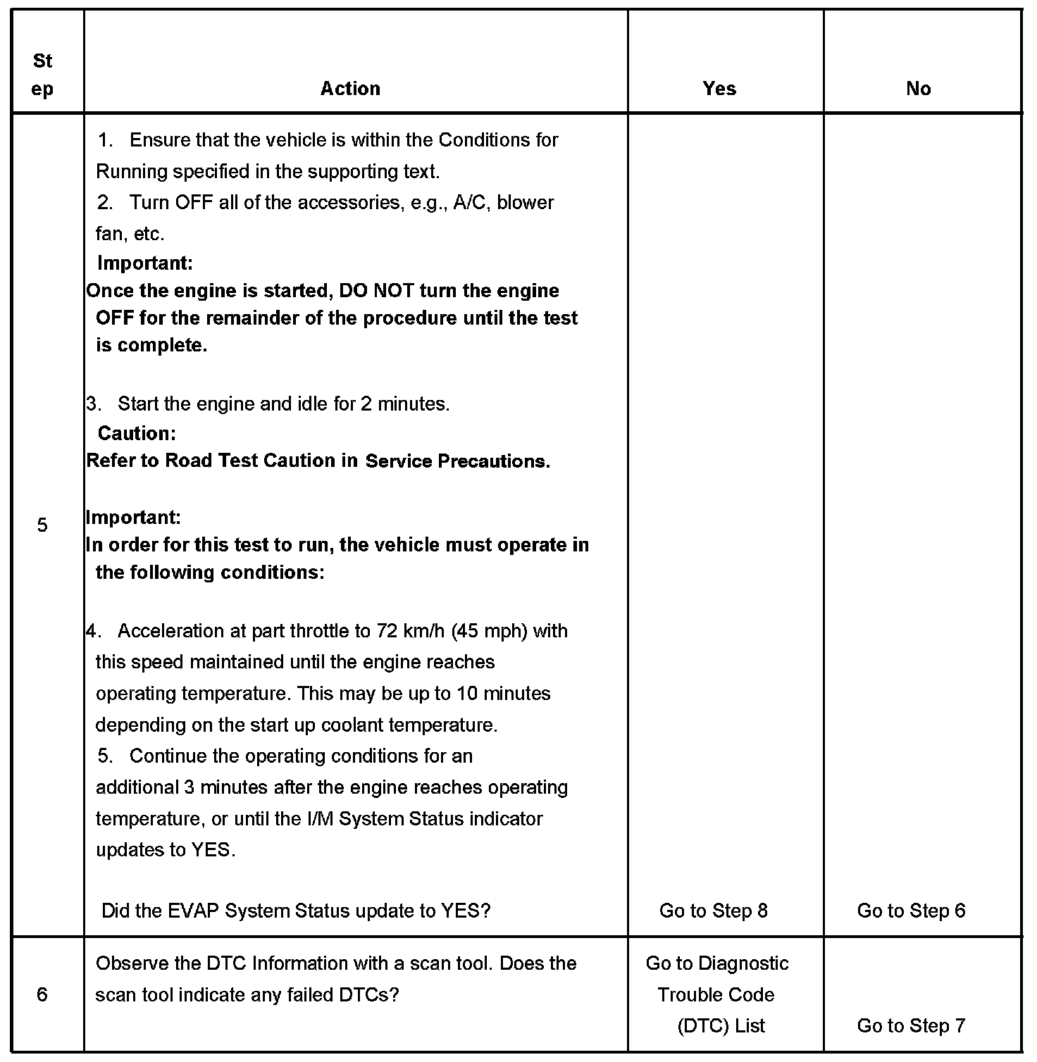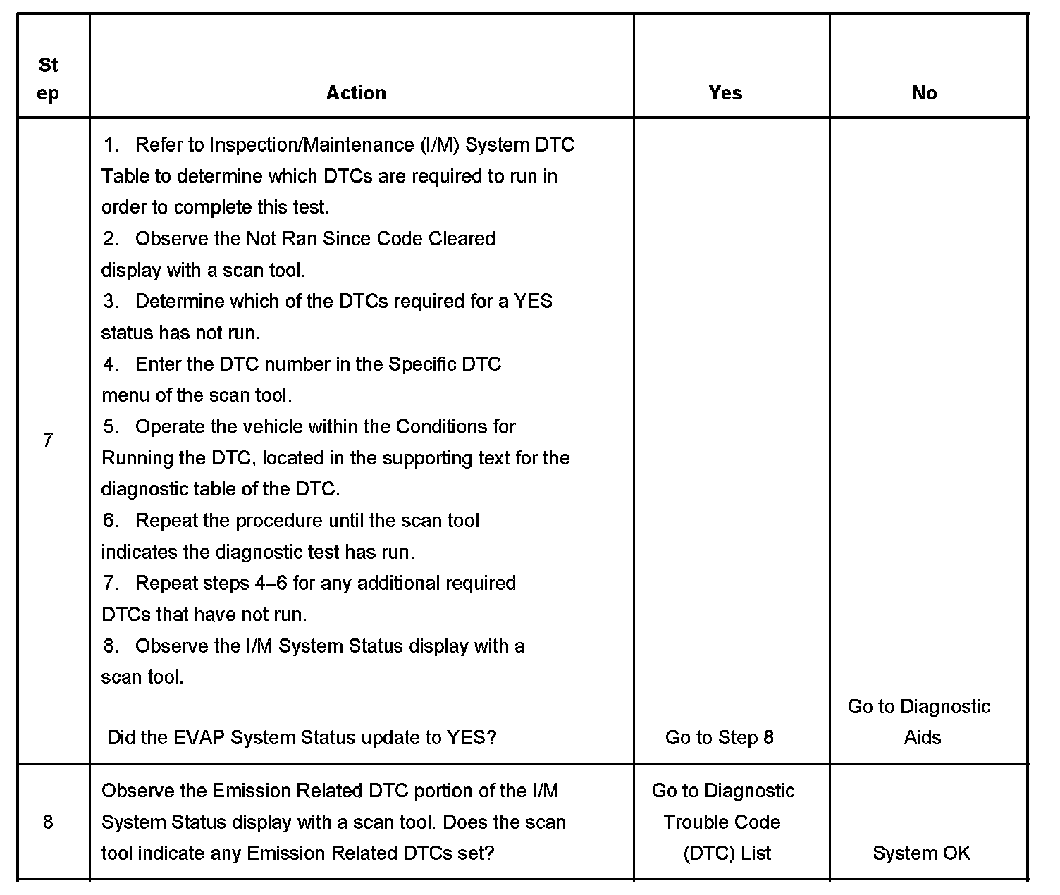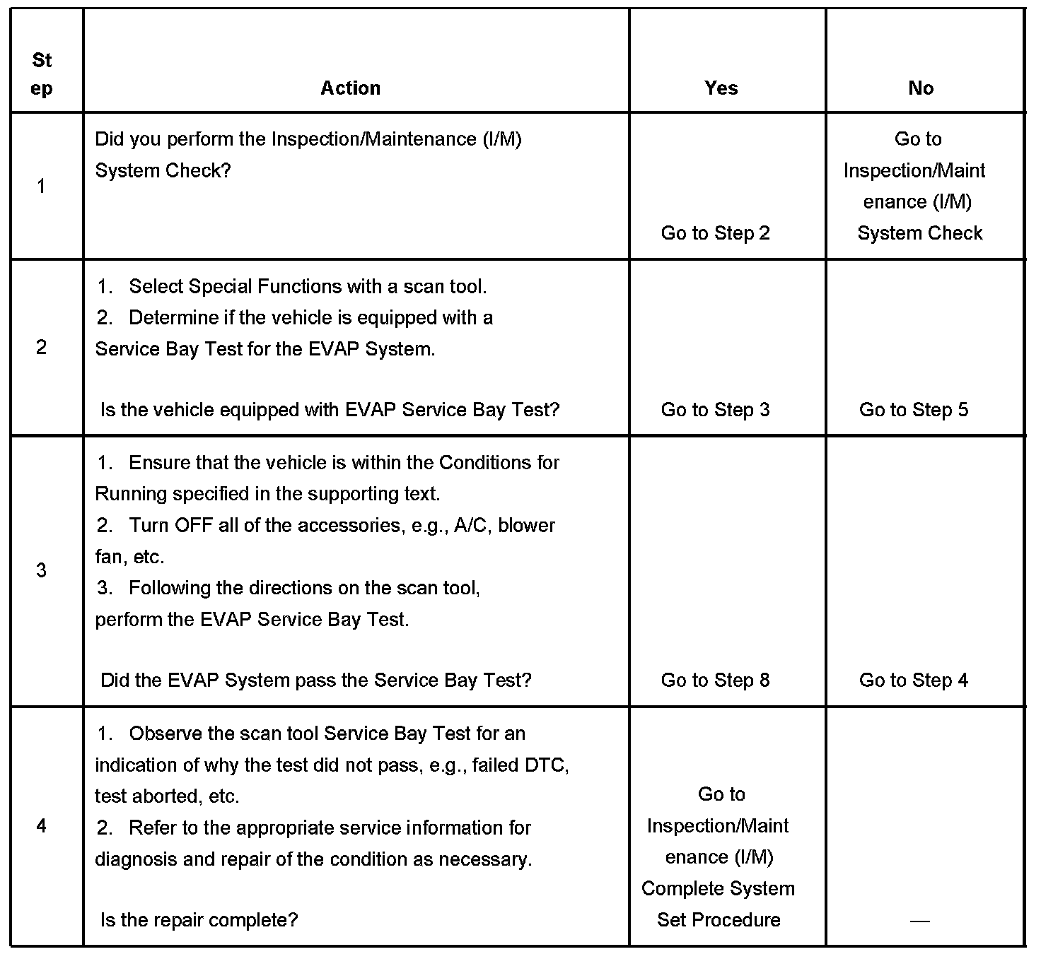 The purpose of this test is to satisfy the enable criteria necessary to execute I/M readiness diagnostics for the evaporative emission (EVAP) system. The test may be used to set the I/M System Status indicators to YES. The I/M System Status display on the scan tool provides an indication of whether the control module has completed the required tests. The I/M System Status does not indicate that the tests have passed or failed. When all of the diagnostics for a specific system have run and passed, the I/M System Status will update to YES. If a test for a specific system has failed, the I/M System Status will update to YES, indicating a determination was made, even if all of the other tests for that system have not run.