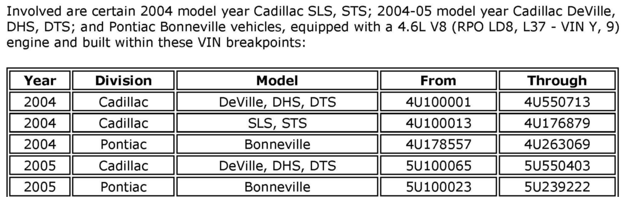 General Motors has decided to conduct a Voluntary Emission Recall involving certain 2004 model year Cadillac SLS, STS; 2004-05 model year Cadillac DeVille, DHS, DTS; and Pontiac Bonneville vehicles, equipped with a 4.6L V8 (RPO LD8, L37 - VIN Y, 9) engine. The secondary air injection (SAI) system may have been disabled as the result of a previous service procedure that included Powertrain Control Module (PCM) reprogramming or replacement.