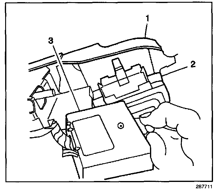 3. Move the bottom of the module (3) towards the brake pedal first and then slide down from the bracket (2).