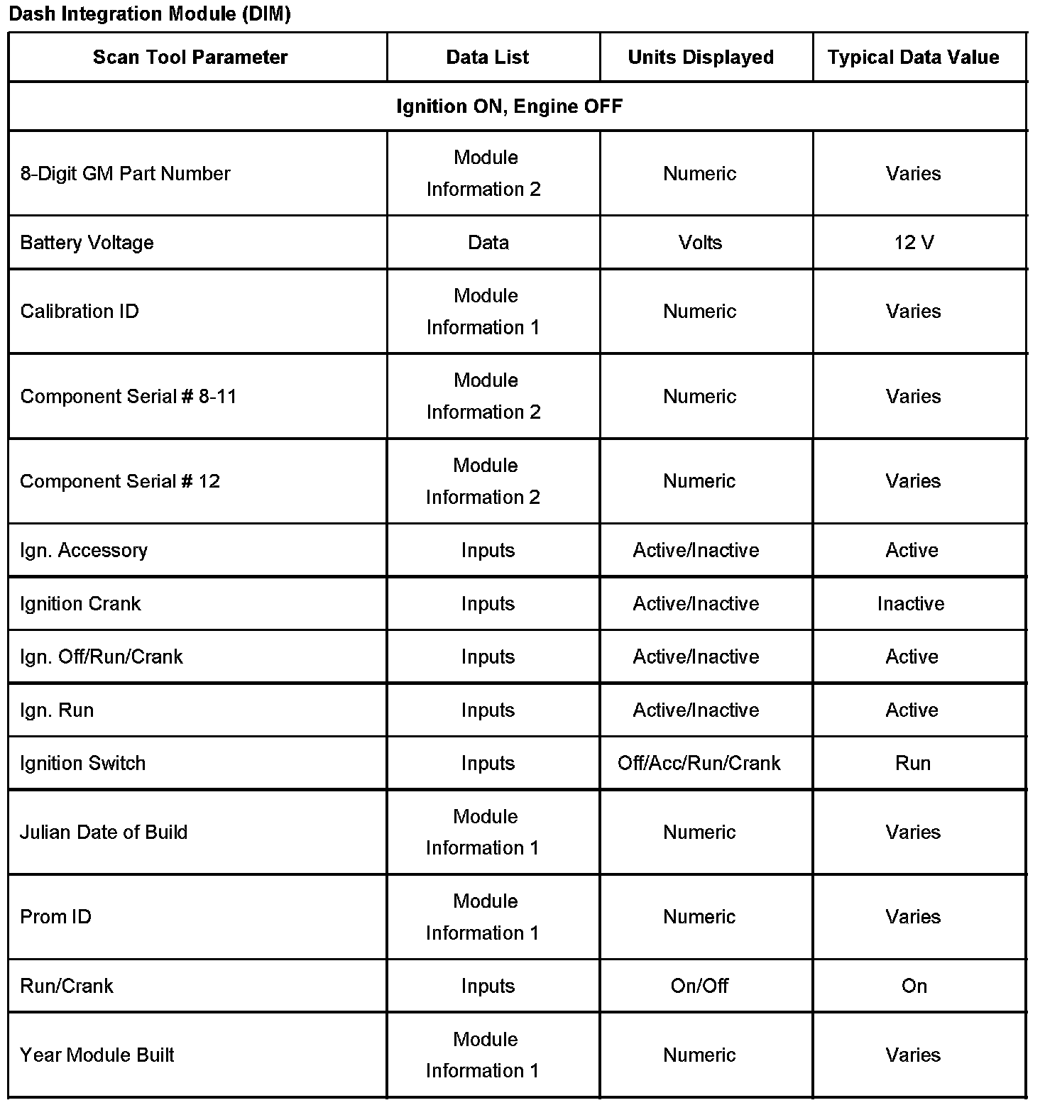 Scan Tool Data List - Dash Integration Module (DIM)