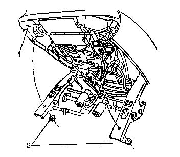 2. Install the new rivets (2) to the heated seat module (1) in order to secure the heated seat module to the seat cushion frame.