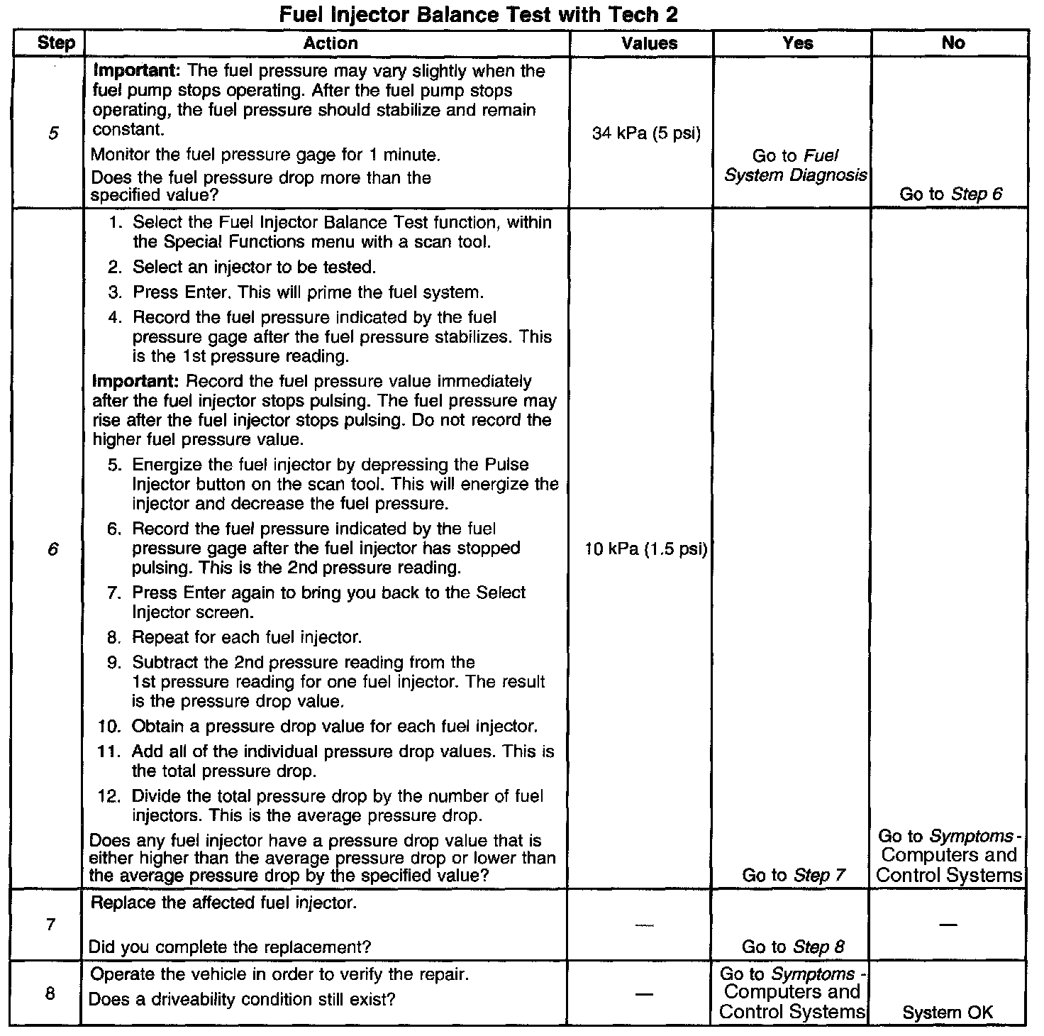 6. If the pressure drop value for each fuel injector is within 10 kPa (1.5 psi) of the average pressure drop value, the fuel injectors are flowing properly. Calculate the pressure drop value for each fuel injector by subtracting the second pressure reading from the first pressure reading.