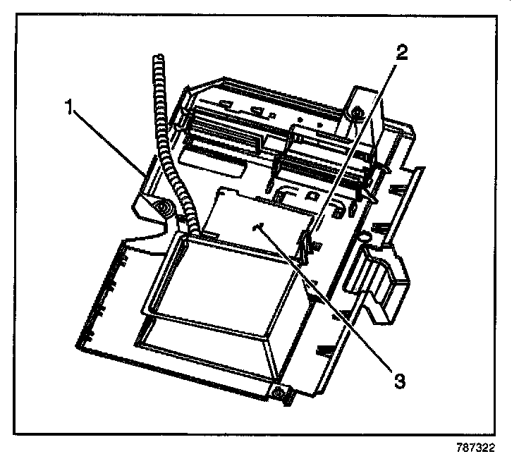 4. Push in on the top of the VCIM (1) until an audible click is heard, indicating the retaining tab (2) has securely fastened the VCIM (1) to the electrical component mounting bracket (3).
