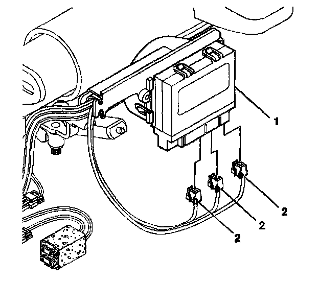4. Remove the control module (2) from the wire harness shield (1) of the lower steering column by pulling the module outward to release the retaining clips and sliding the module downward.