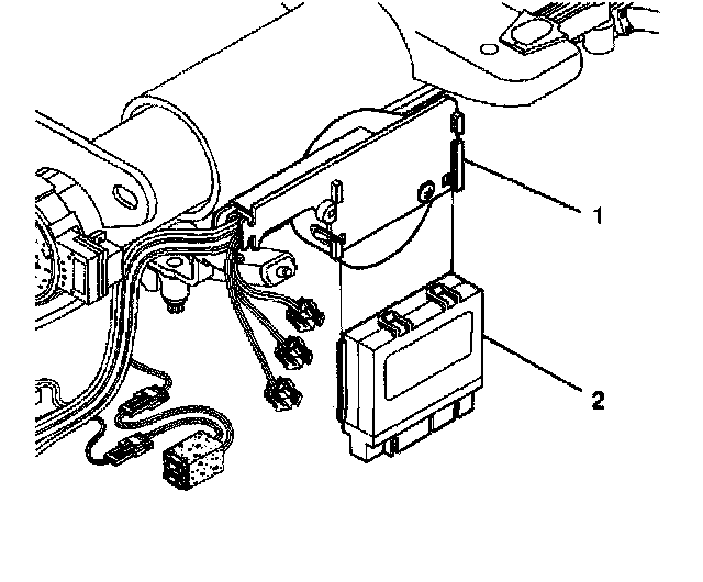 1. Install the control module (2) to the wire harness shield (1) of the lower steering column.