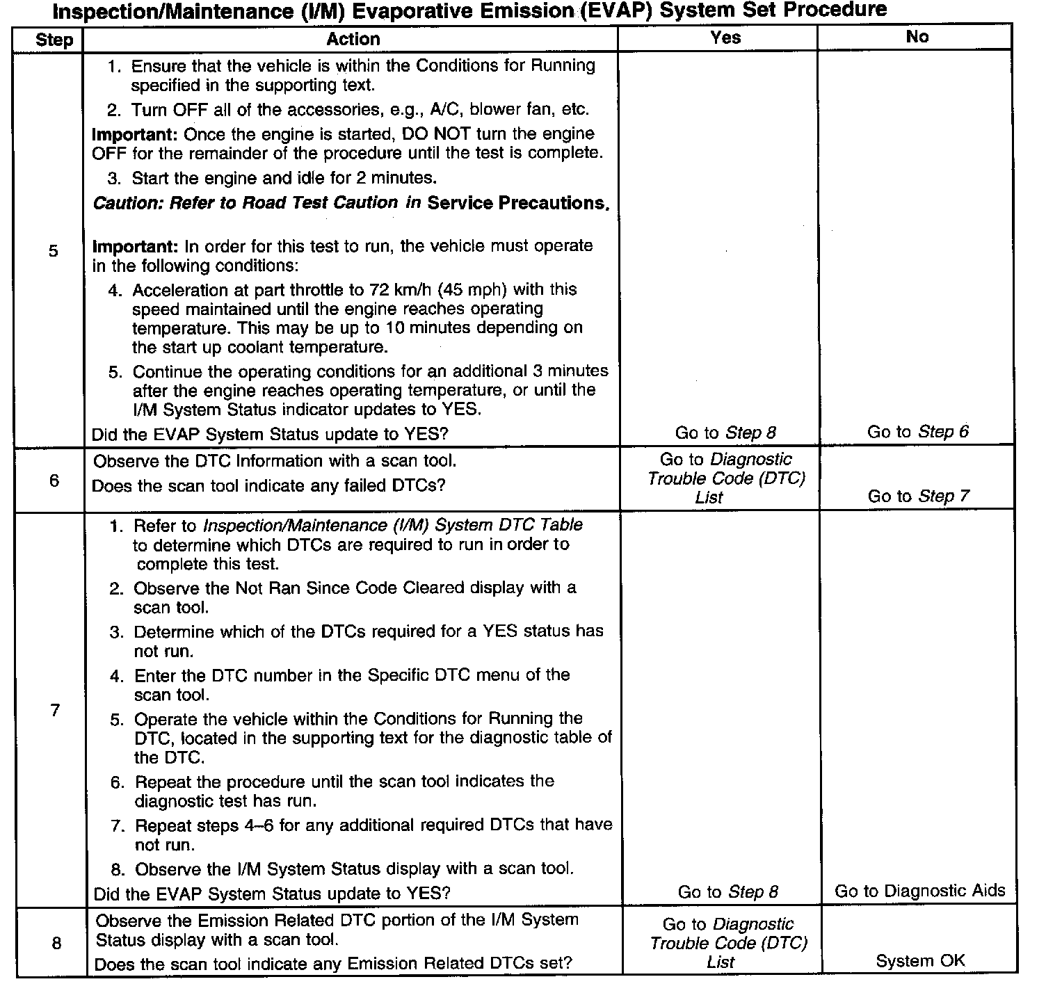 The purpose of this test is to satisfy the enable criteria necessary to execute I/M readiness diagnostics for the evaporative emission (EVAP) system. The test may be used to set the I/M System Status indicators to YES. The I/M System Status display on the scan tool provides an indication of whether the control module has completed the required tests. The I/M System Status does not indicate that the tests have passed or failed. When all of the diagnostics for a specific system have run and passed, the I/M System Status will update to YES. If a test for a specific system has failed, the I/M System Status will update to YES, indicating a determination was made, even if all of the other tests for that system have not run.