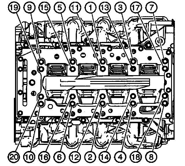 ^ Tighten the lower crankcase bearing bolts (1 through 20) to 20 Nm (15 ft. lbs.) in the proper sequence.