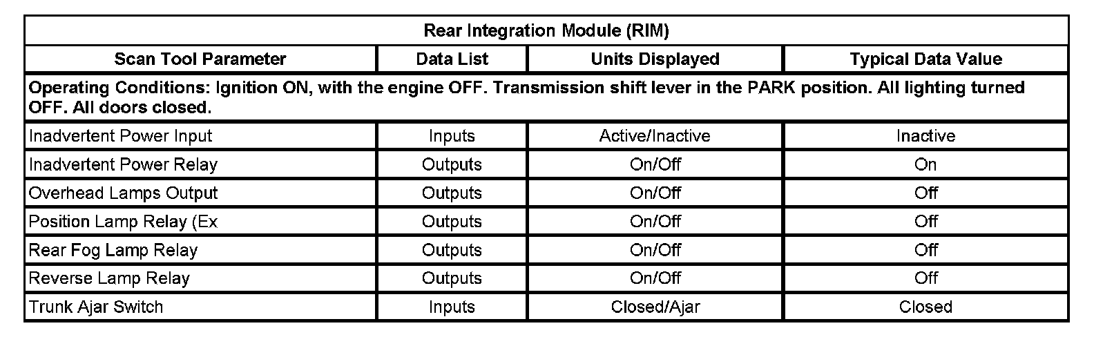 Scan Tool Data List - Rear Integration Module (RIM)