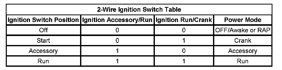 Those modules that have discrete ignition signal inputs also remain in the state dictated by the last valid PMM message received on the serial data circuits. They then check the state of their discrete ignition input to determine the current valid state. If the discrete ignition input is active, battery positive voltage, the modules will fail-safe to the RUN power mode. If the discrete ignition input is not active, open or 0 voltage, the modules will fail-safe to OFF-AWAKE. In this state the modules are constantly checking for a change status message on the serial data circuits and can respond to both local inputs and serial data inputs from other modules on the vehicle.