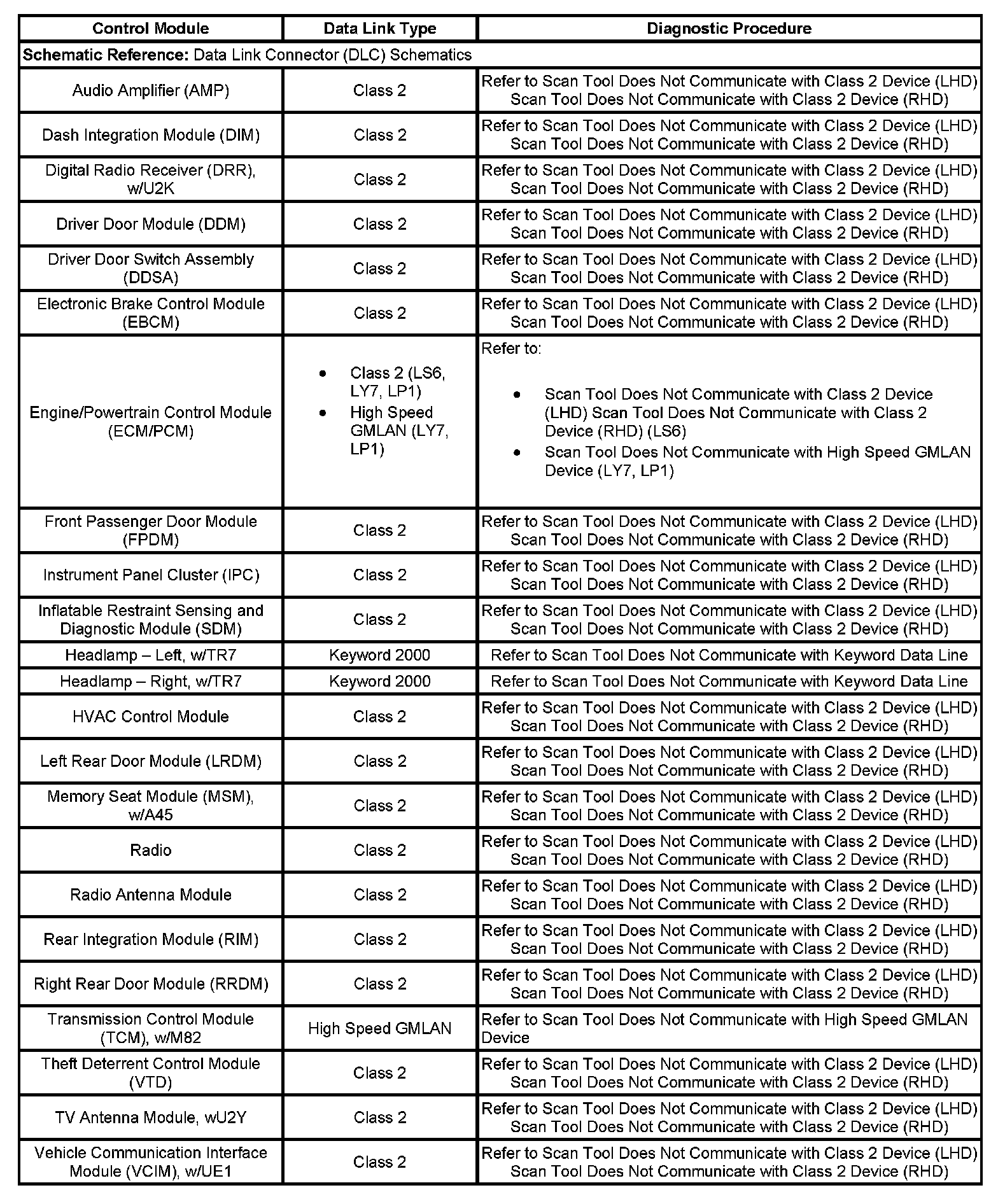 This table identifies which serial data link that a particular module uses for in-vehicle data transmission. Some modules may use more than one data link to communicate. This table is used to assist in correcting a communication malfunction between the control module and the scan tool. For the description and operation of these serial data communication circuits, refer to Data Link Communications Description and Operation.