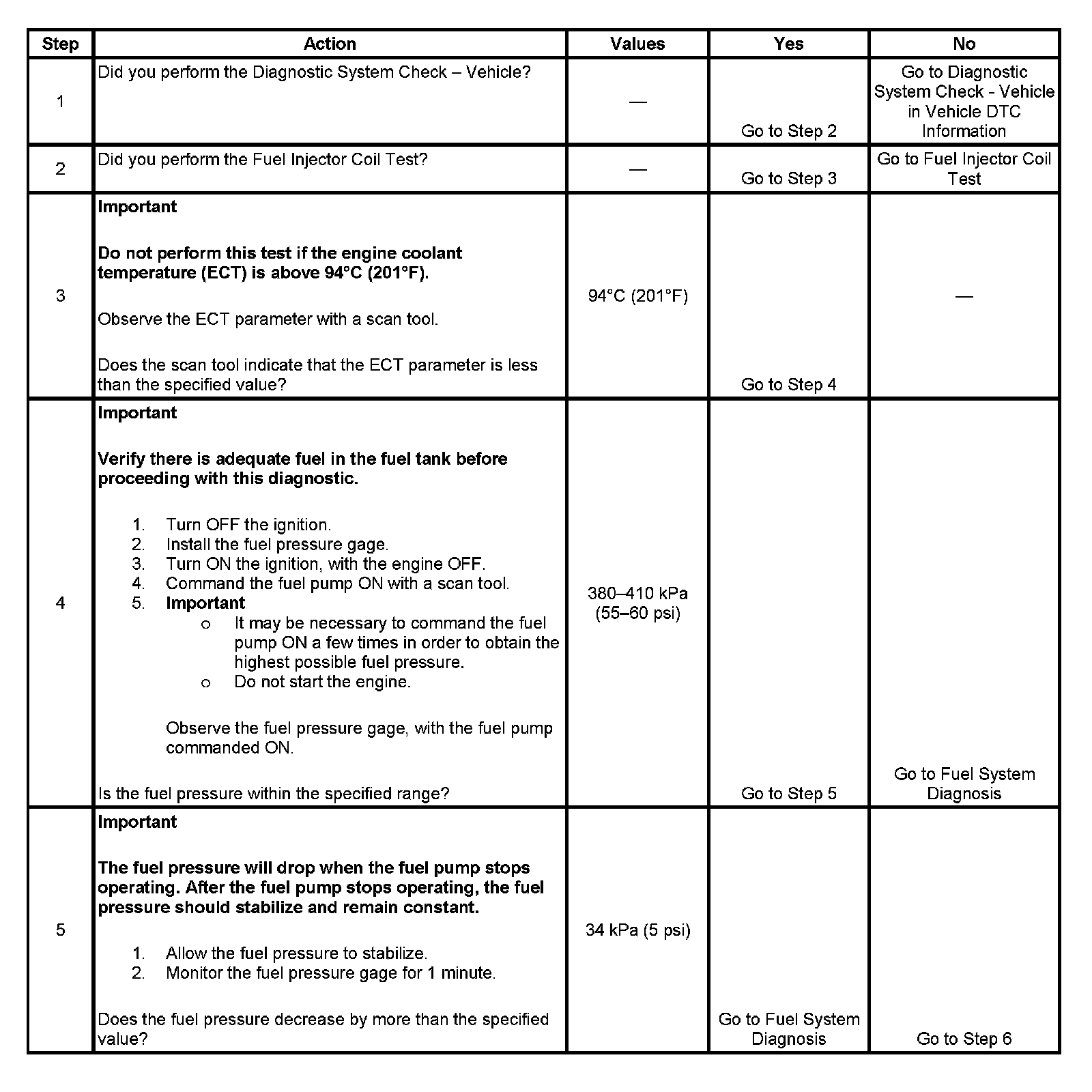 5. This step tests for an internal fuel leak. If the fuel pressure drops during this test, then an internal loss of pressure is indicated. The fuel pressure should reach a steady value.