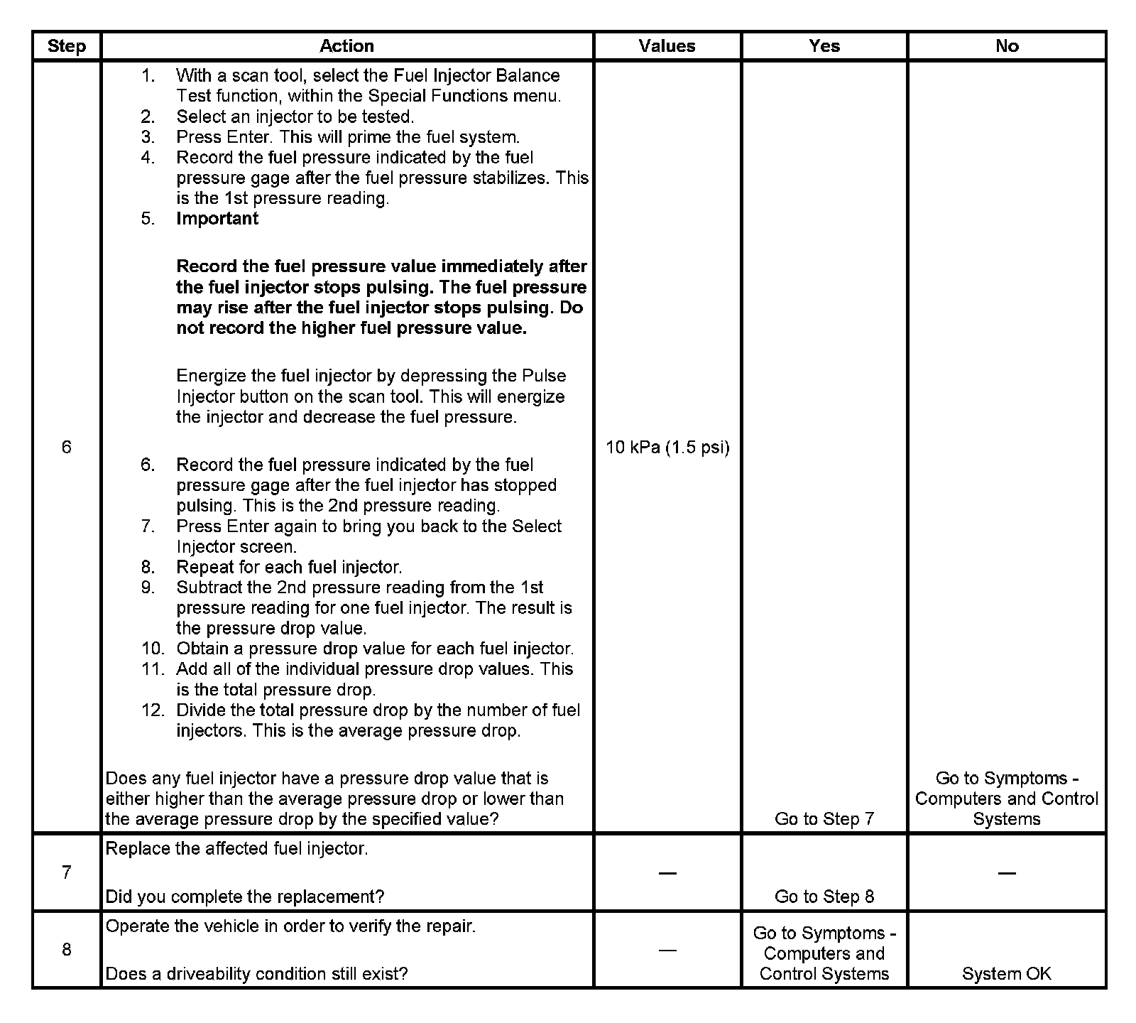 6. If the pressure drop value for each fuel injector is within 10 kPa (1.5 psi) of the average pressure drop value, the fuel injectors are flowing properly. Calculate the pressure drop value for each fuel injector by subtracting the second pressure reading from the first pressure reading.