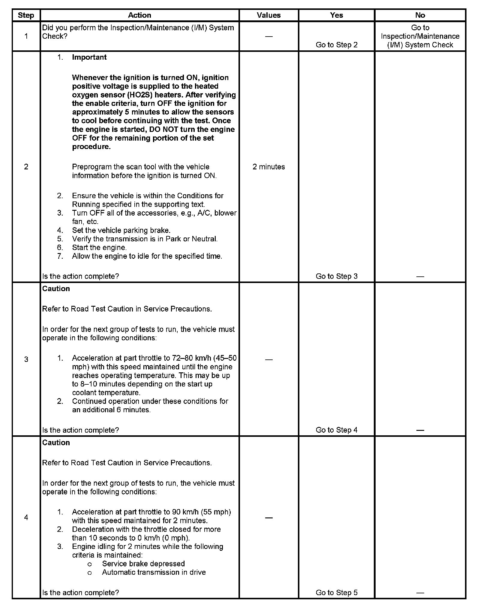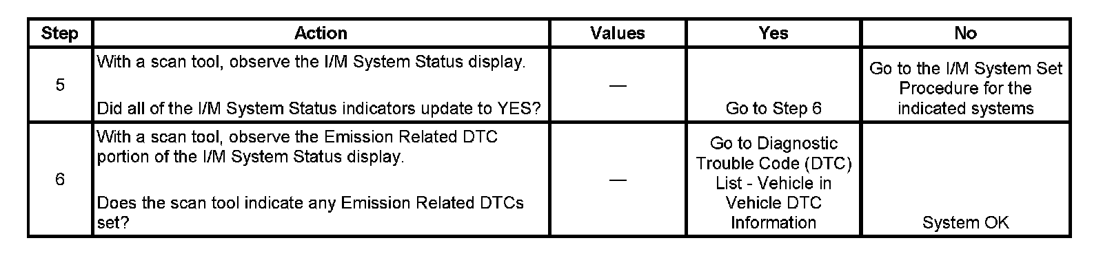 The scan tool can be used to monitor each of the I/M System Status indicators during the I/M Complete System Set Procedure. When all of the indicators for a test step have updated to YES, testing can move on to the next step even if the remaining portion of the test is not complete. For example, step 3 is designed to run the catalyst and HO2S tests. The procedure instructs the technician to operate the vehicle in the enable conditions for 8-10 minutes. If both tests have updated to YES within 4 minutes, it is not necessary to continue with the enable conditions and testing can advance to the next step.