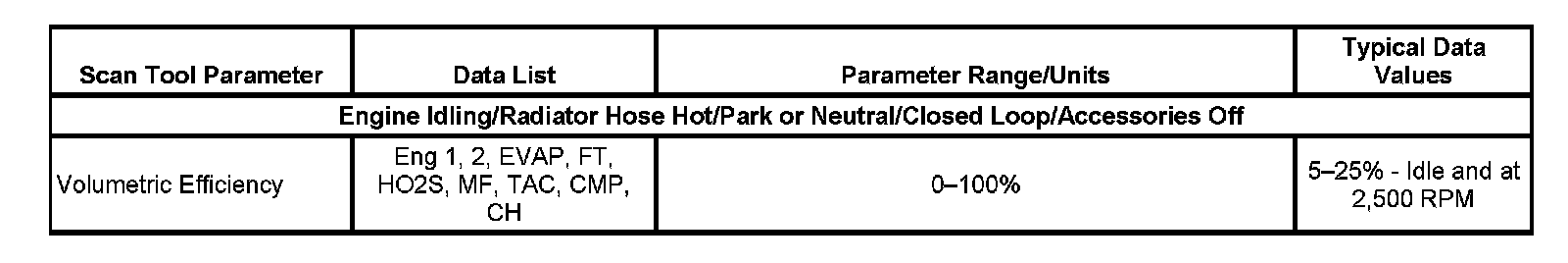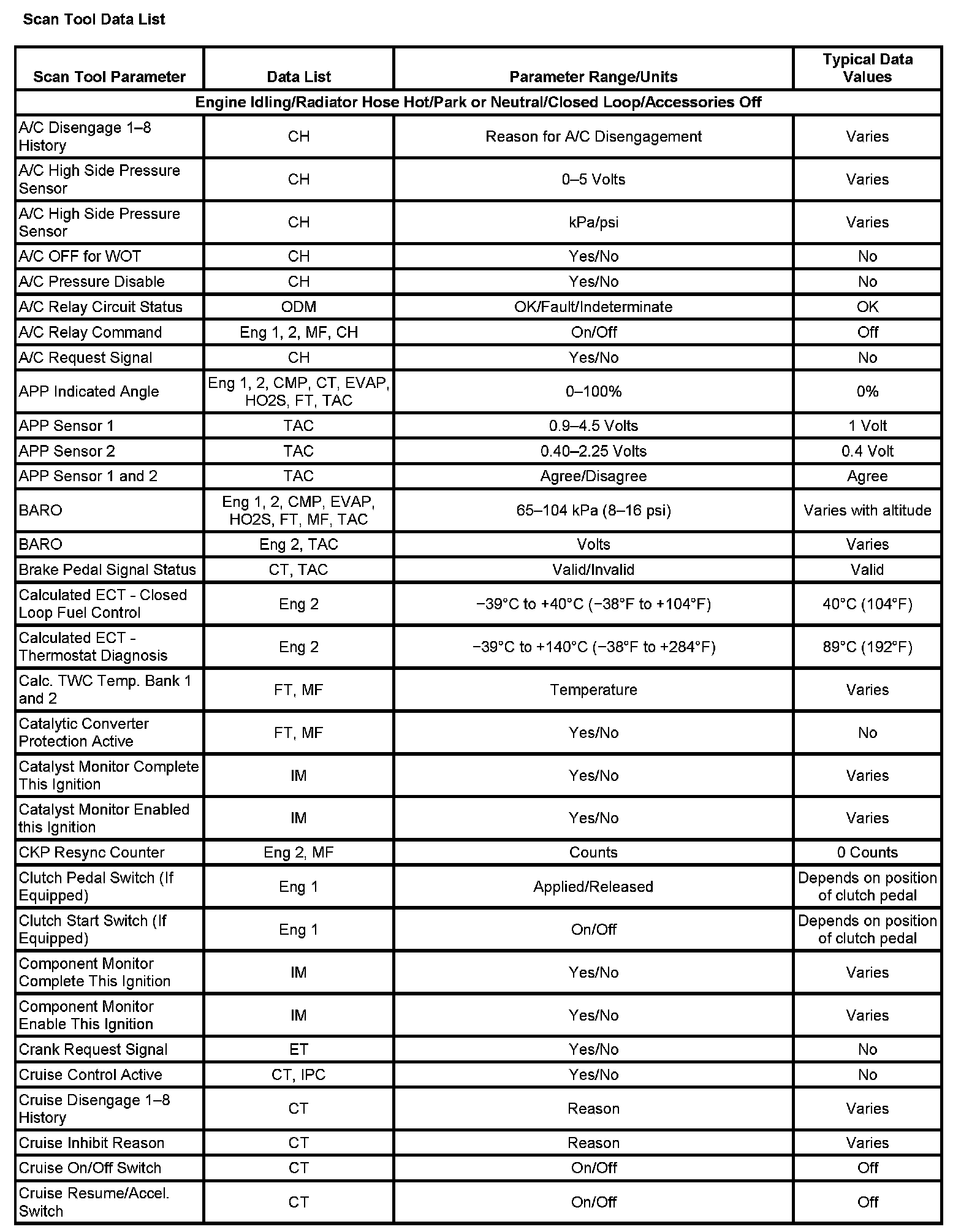 The Engine Scan Tool Data List contains all engine related parameters that are available on the scan tool. The list is arranged in alphabetical order. A parameter may appear in any one of the data lists, and in some cases may appear more than once, or in more than one data list in order to group certain related parameters together.