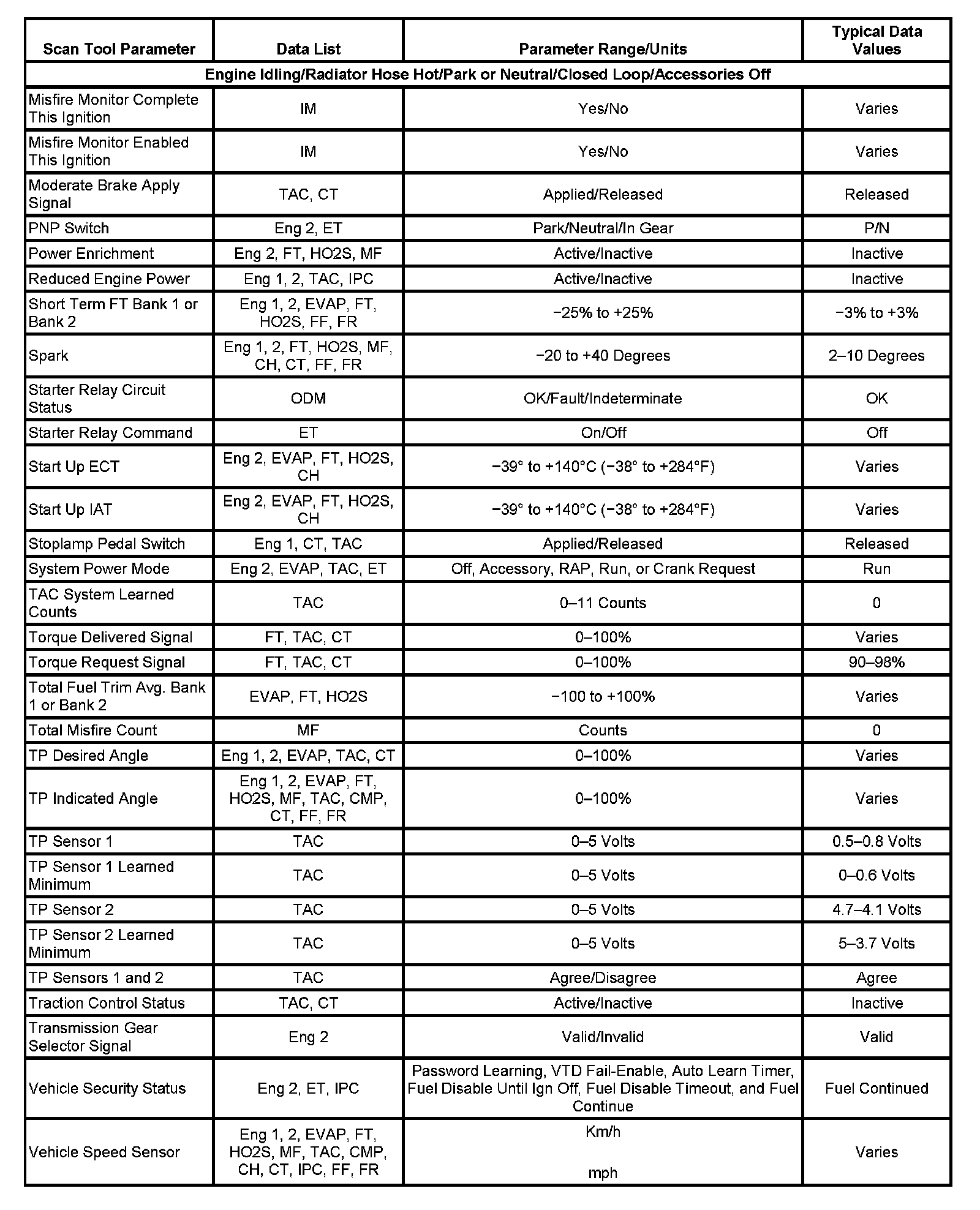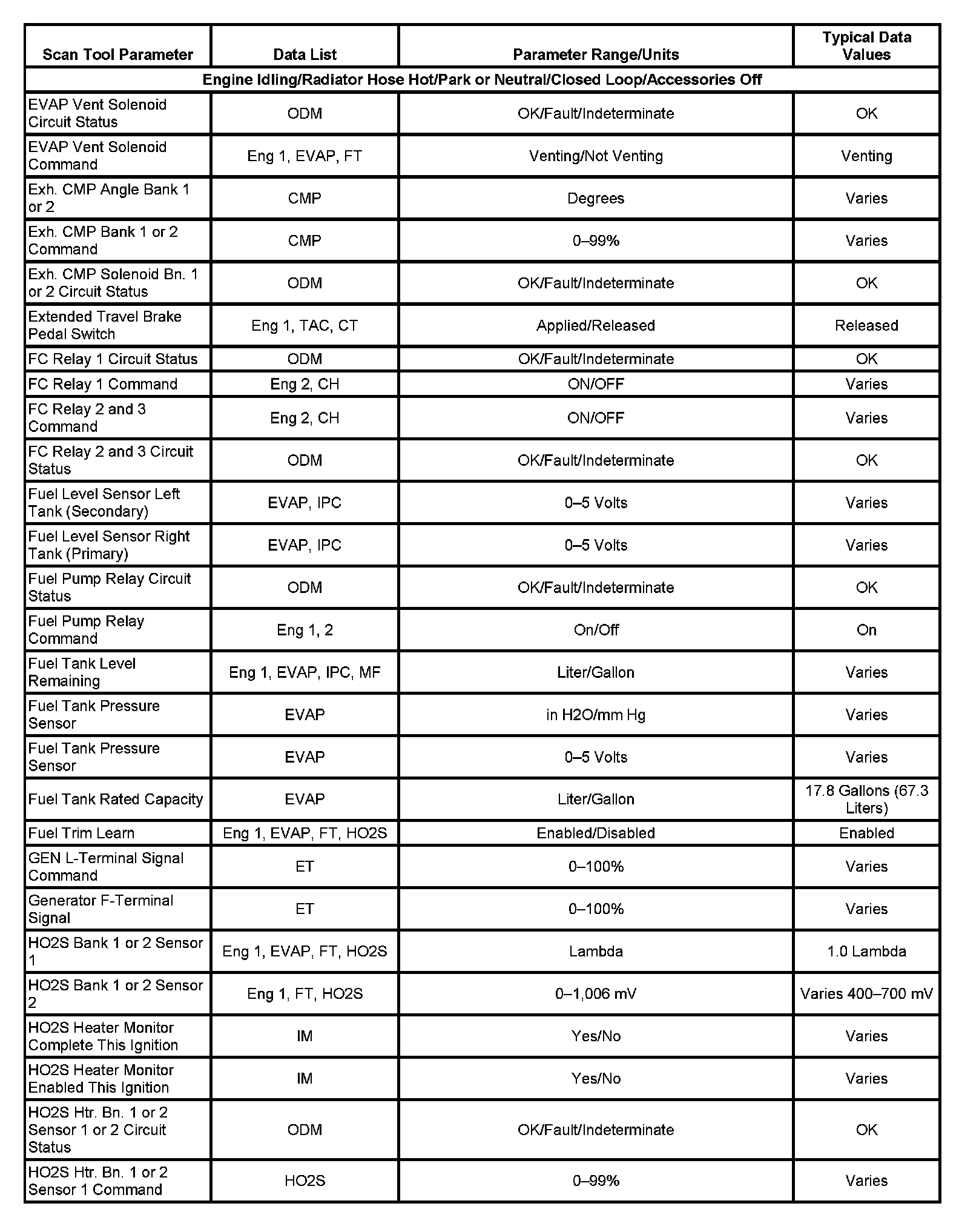 Scan tool values from an engine that is operating correctly may be used for comparison with the engine you are diagnosing. The Engine Scan Tool Data List represents the values that would be seen on a normal operating engine.