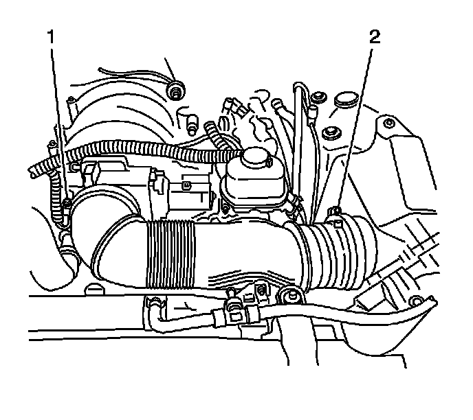 2. Loosen the air cleaner outlet duct clamps (1, 2).