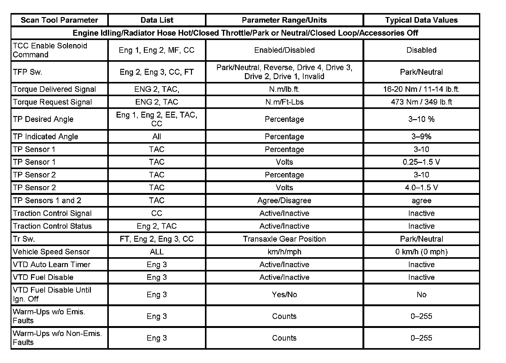 Only the parameters listed below are referenced in this service data for use in diagnosis. If all values are within the typical range described below, refer to Symptoms - Computers and Control Systems for diagnosis. Symptom Related Diagnostic Procedures