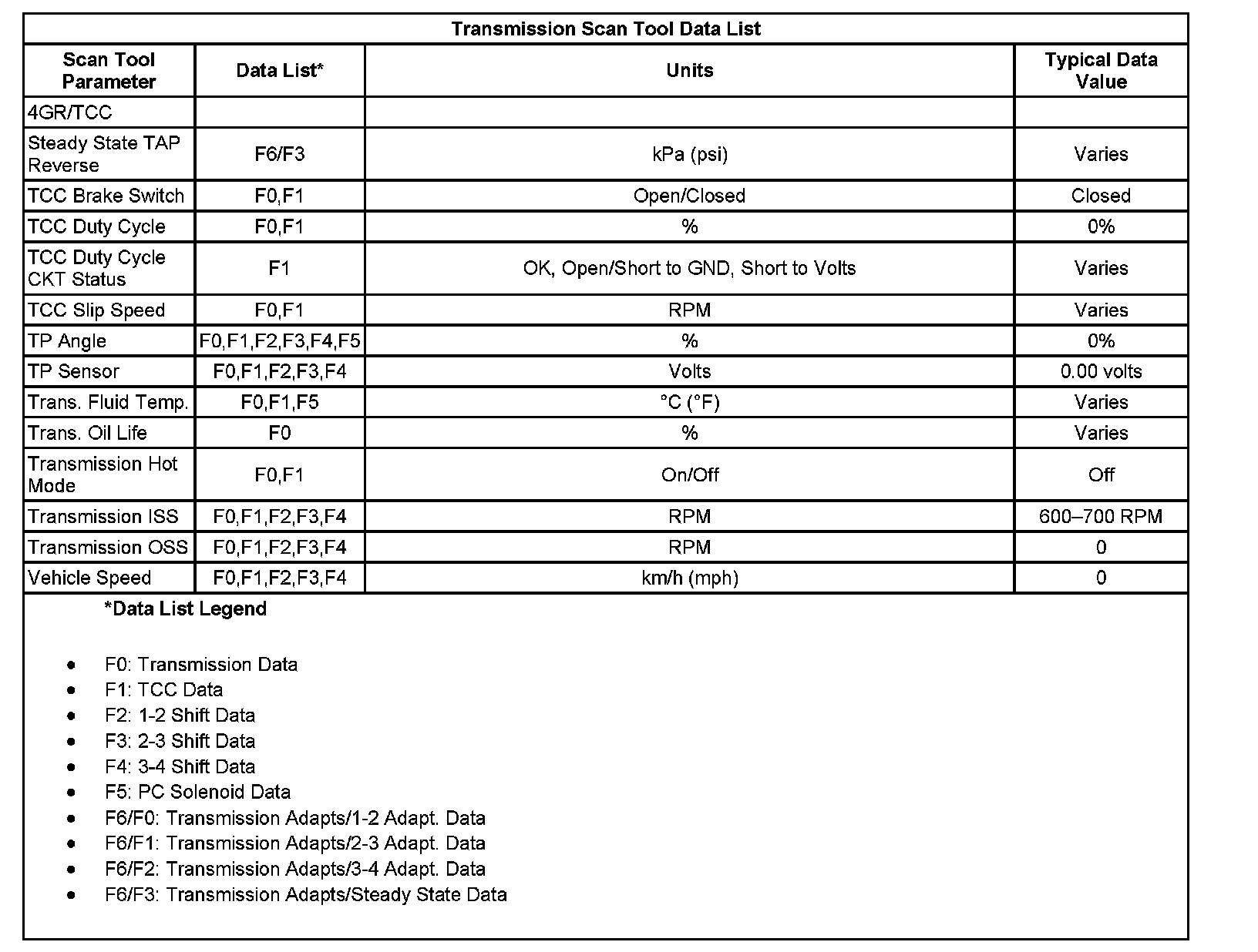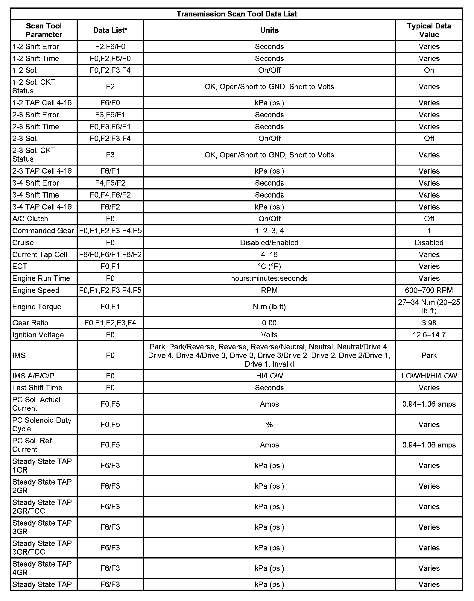 Transmission Scan Tool Data List