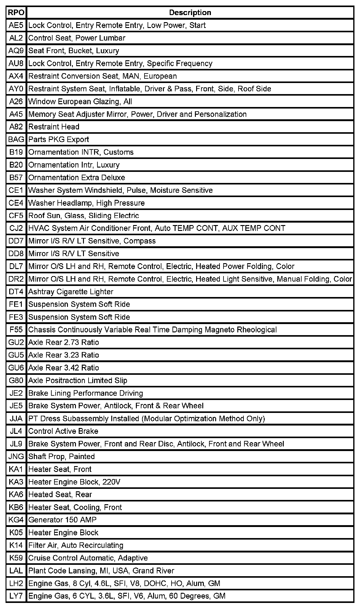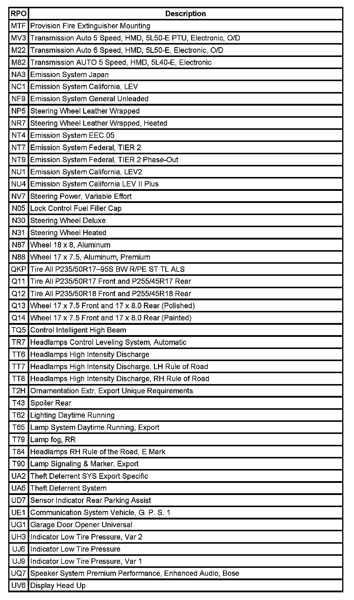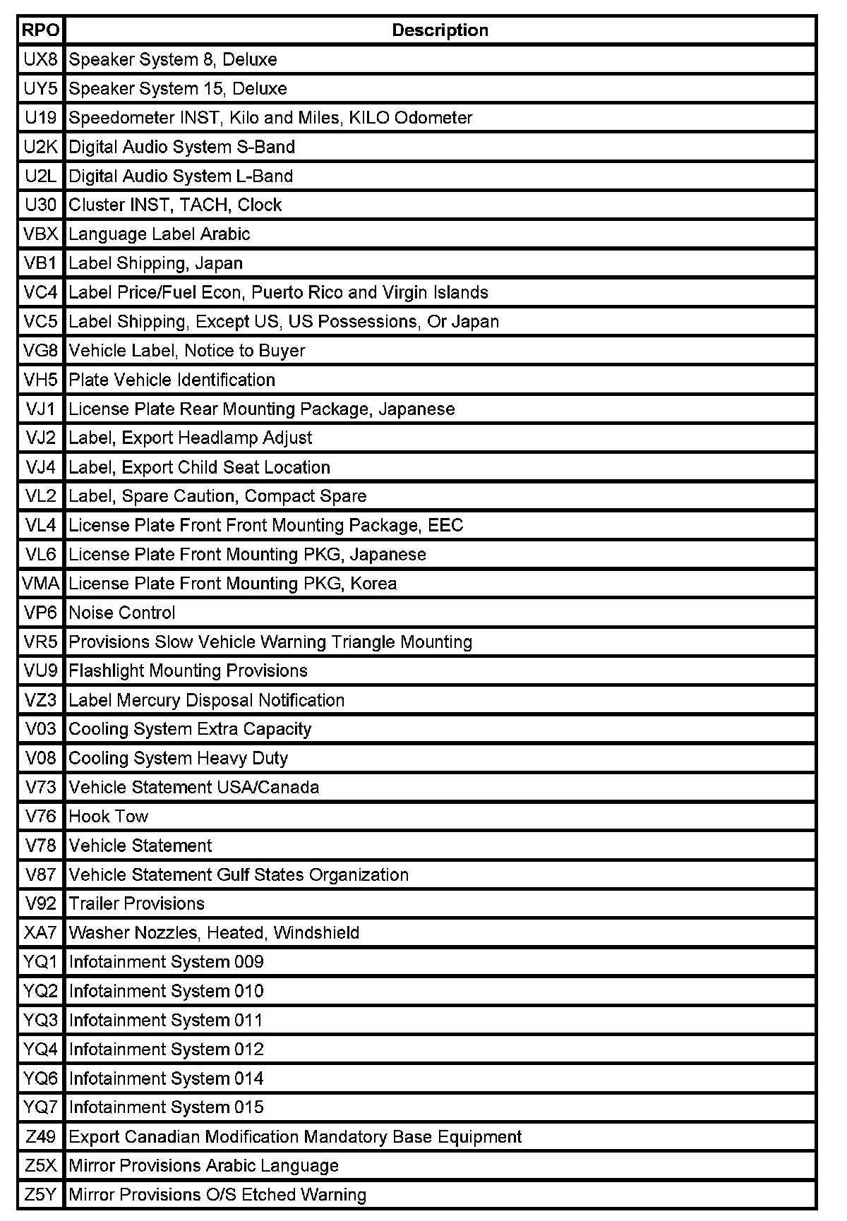 The table provides the description of the Regular Production Option (RPO) codes that are available on the vehicle. The vehicle's RPO list is printed on the Service Parts Identification Label.