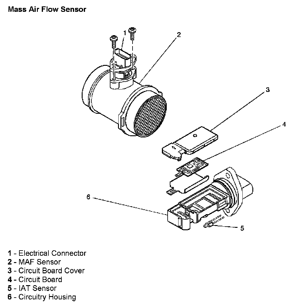 The MAF sensor measures the amount of air coming into the engine. This direct airflow measurement is more accurate than the calculated airflow information obtained from the other sensor inputs. The MAF sensor also houses an integrated intake air temperature (IAT) sensor. The MAF sensor uses the following circuits: