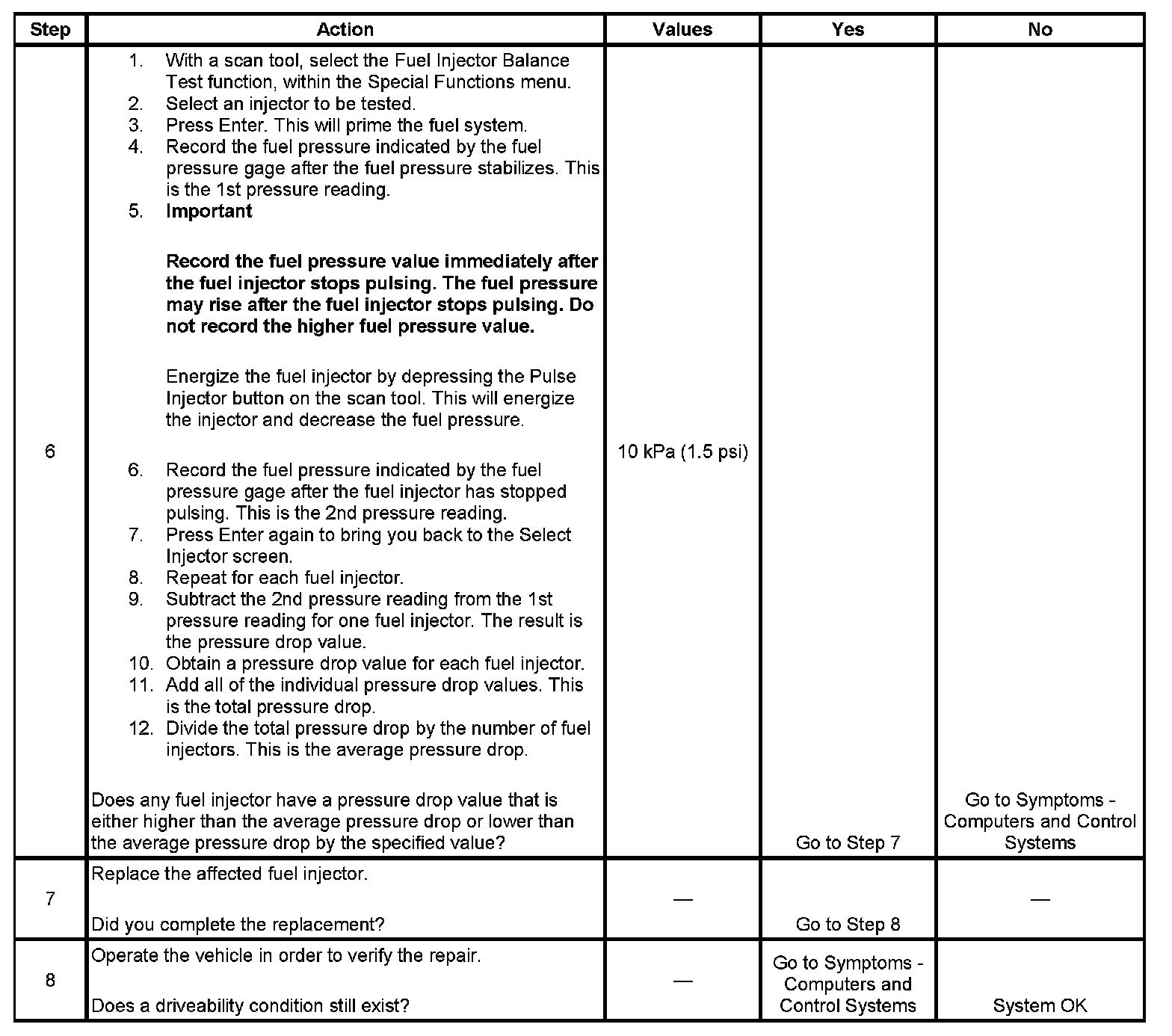 6. If the pressure drop value for each fuel injector is within 10 kPa (1.5 psi) of the average pressure drop value, the fuel injectors are flowing properly. Calculate the pressure drop value for each fuel injector by subtracting the second pressure reading from the first pressure reading.