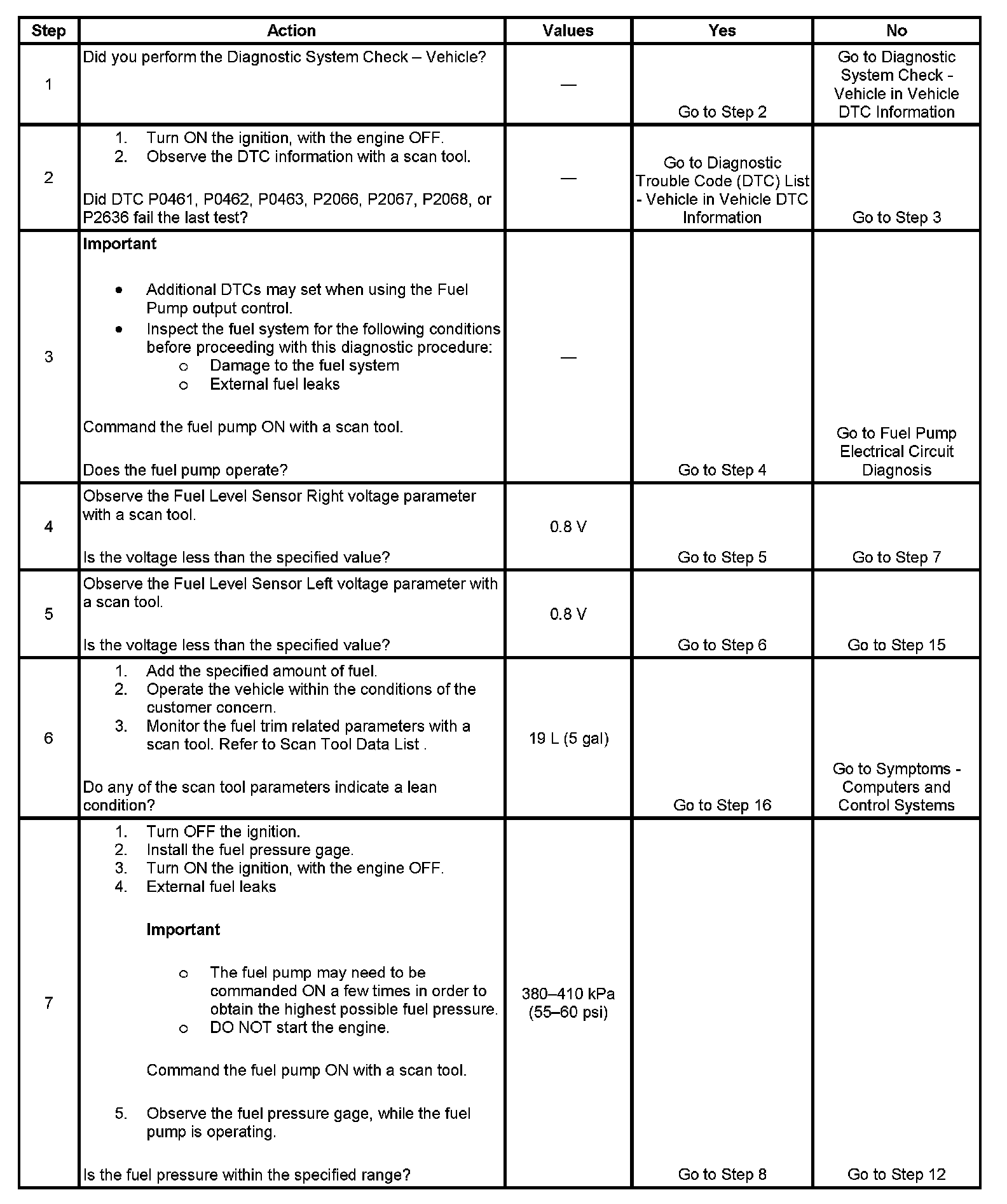 5. This step verifies that the vehicle is not out of fuel. If the right fuel sender is below 0.8 volts, and the left fuel sender is above 0.8 volts, a fuel transfer condition exists.