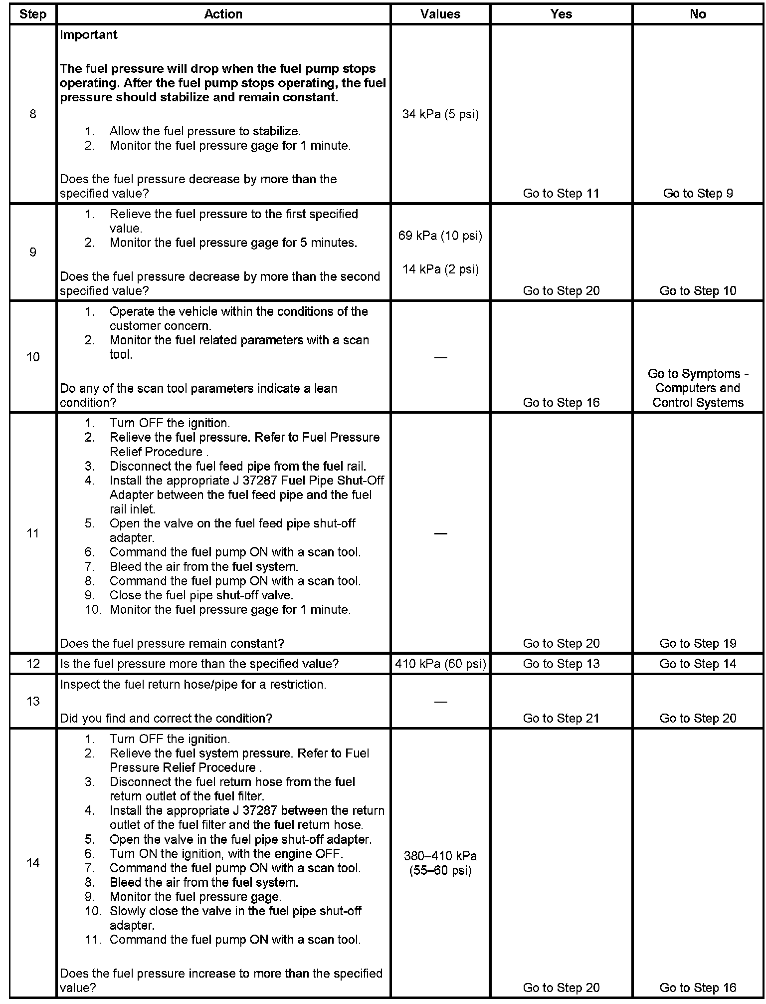 8. This step tests for an internal fuel leak. If the fuel pressure drops during this test, then an internal loss of pressure is indicated.
