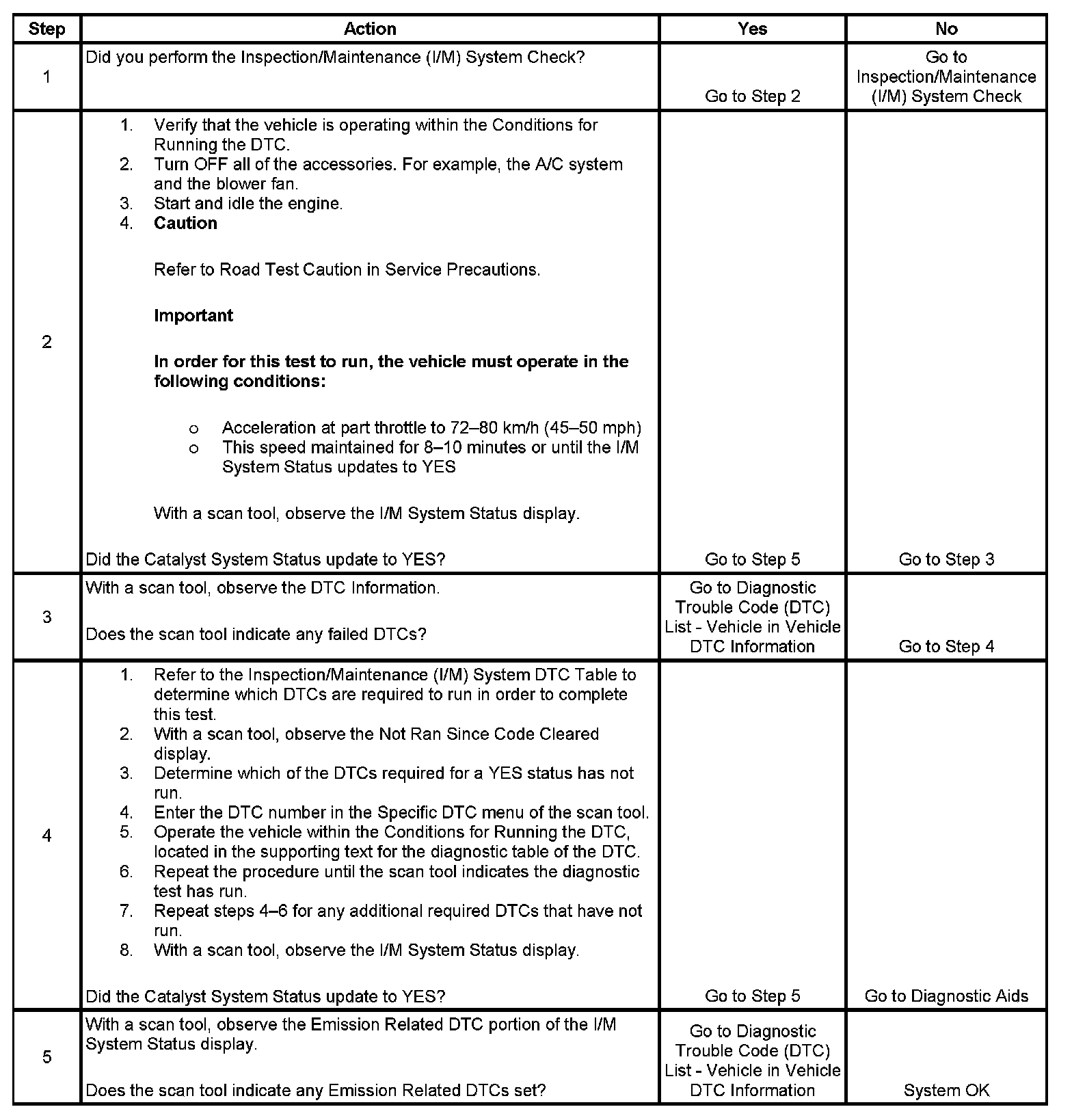 The purpose of this test is to satisfy the enable criteria necessary to execute I/M readiness diagnostics for the catalyst system. The test may be used to set the I/M System Status indicators to YES. Ensure the vehicle meets the requirements listed in Conditions for Running before performing this test. Failure to meet the necessary requirements may produce inaccurate test results.