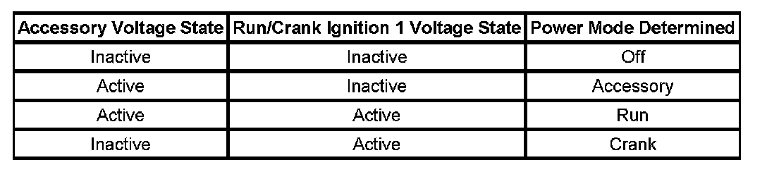 - Run/Crank Ignition 1 voltage, active in a remote start request and in Run and Crank power modes.