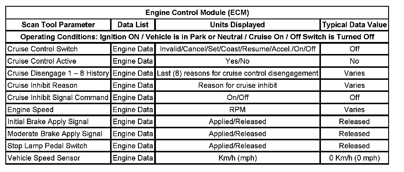 The typical data values are obtained from a properly operating vehicle under the conditions specified in the first row of the scan tool data list table. Comparison of the parameter values from the suspect vehicle with the typical data values may reveal the source of the customer concern.
