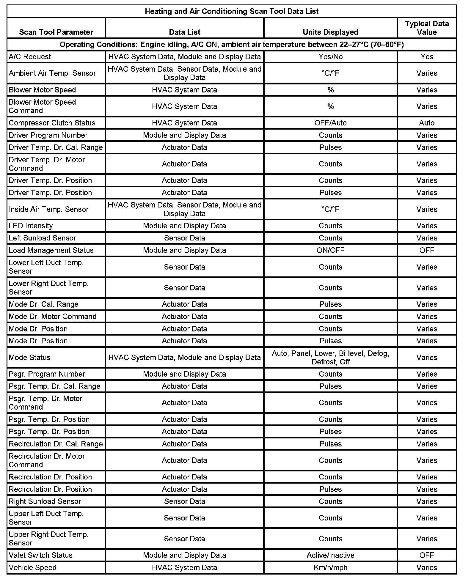 Use the Scan Tool Data Display Values and Definitions Information in order to assist in diagnosing the HVAC control module concerns. Compare the vehicles actual scan tool data with the typical data display value table information. Use the data information in order to aid in understanding the nature of the concern when the vehicle does not match with the typical data display values.