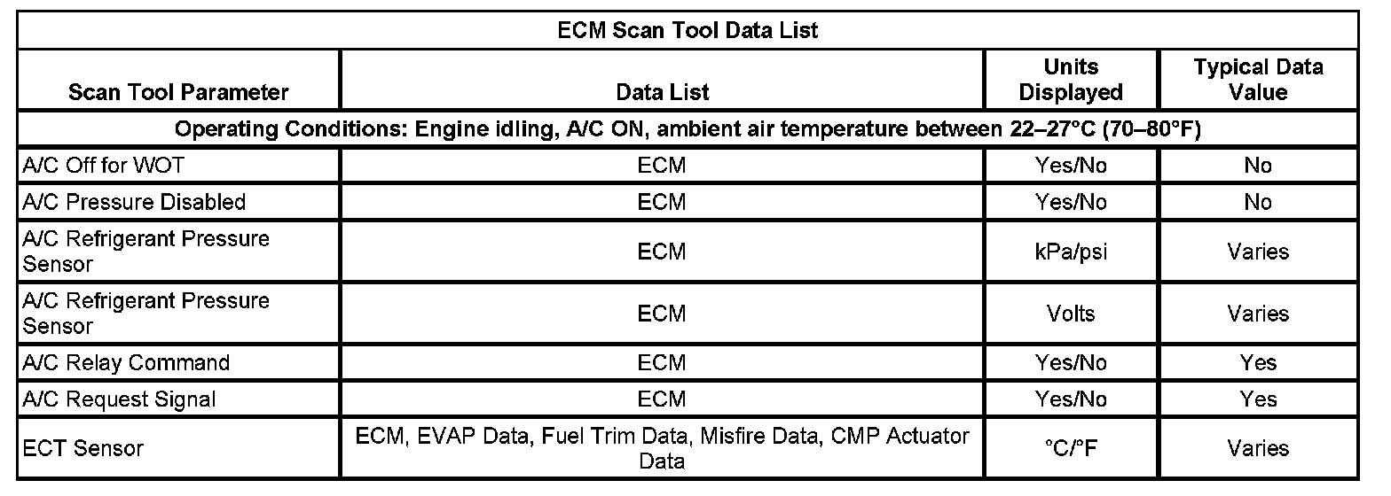 The scan tool data values were taken from a known good vehicle under the following conditions: