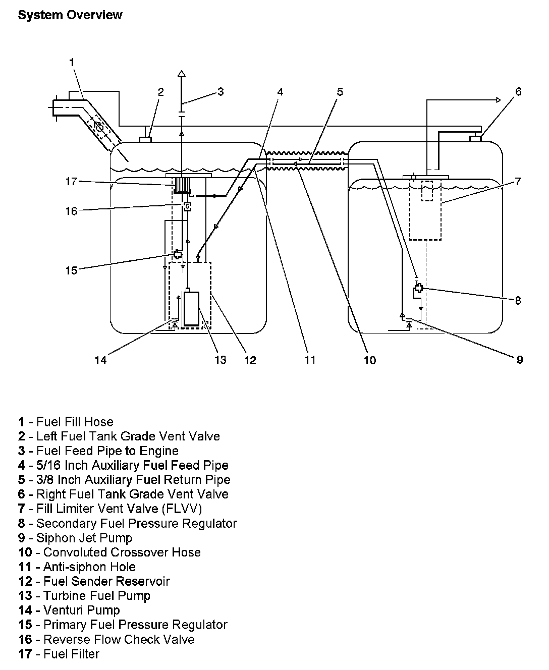 Two fuel tanks store the fuel supply. An electric turbine style fuel pump (13) attaches to the fuel sender assembly inside the left fuel tank. The fuel pump supplies high pressure fuel through the fuel filter (17) and the fuel feed pipe (3) to the fuel injection system. The fuel pump provides fuel at a higher rate of flow than is needed by the fuel injection system. The fuel pump also supplies fuel to the venturi pump (14) located on the bottom of the left fuel sender assembly. The function of the venturi pump is to fill the fuel sender assembly reservoir (12). The primary fuel pressure regulator (15), a part of the left fuel sender assembly, maintains the correct fuel pressure to the fuel injection system. The fuel pump and sender assembly contains a reverse flow check valve (16). The check valve, the primary fuel pressure regulator, and the secondary fuel pressure regulator maintain fuel pressure in the fuel feed pipe and the fuel rail in order to prevent long cranking times.