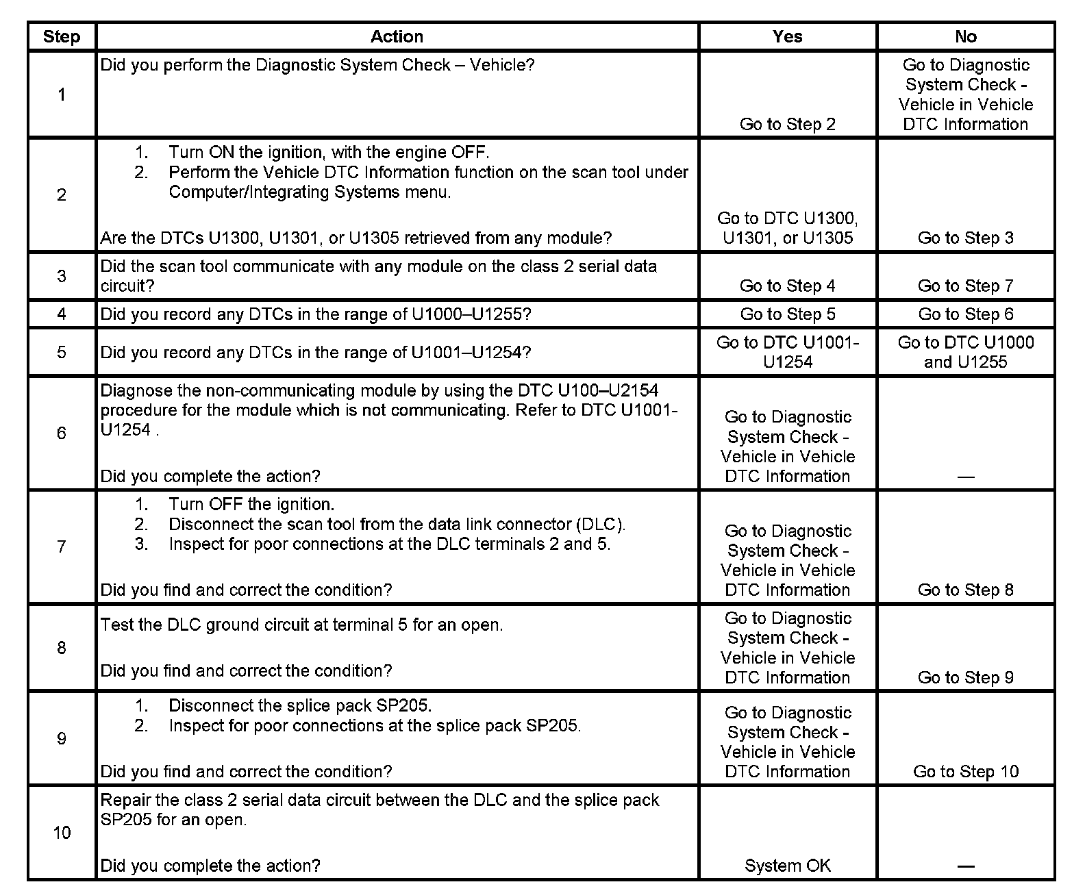 10. An open in the class 2 serial data circuit between the DLC and splice pack SP205 will prevent the scan tool from communicating with any module on the class 2 network. This condition will not set a DTC.