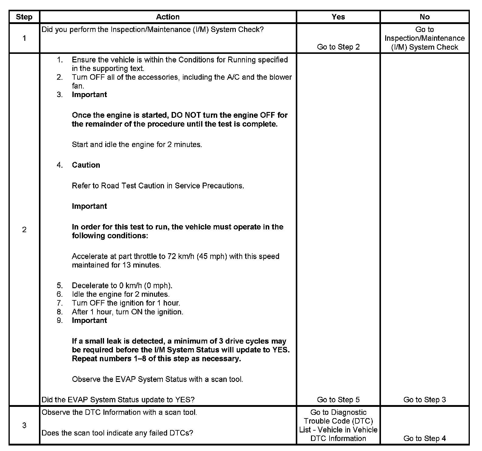 The purpose of this test is to satisfy the enable criteria necessary to execute the inspection/maintenance (I/M) readiness diagnostics for the Evaporative Emission (EVAP) System. The test may be used in order to set the I/M System Status indicators to YES. The I/M System Status Display on the scan tool provides an indication of when the control module has completed the required tests. The I/M System Status does not indicate that the tests have passed or failed. When all of the diagnostics for a specific system have run and passed the I/M System Status will update to YES. If a test for a specific system has failed, the I/M System Status will update to YES, indicating a determination was made, even if all of the other tests for that system have not run. If a small leak is detected, a minimum of 3 drive cycles may be required before the I/M System Status will update to YES. Performing a visual inspection prior to running the EVAP test may prevent having to repeat the test. A failed or aborted test will require the vehicle to cool down in order to meet the enable criteria to run another test.
