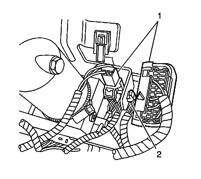 7. Install the 2 electrical connectors (1) to the pump bracket (2).