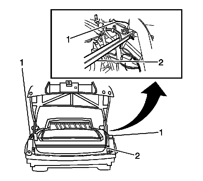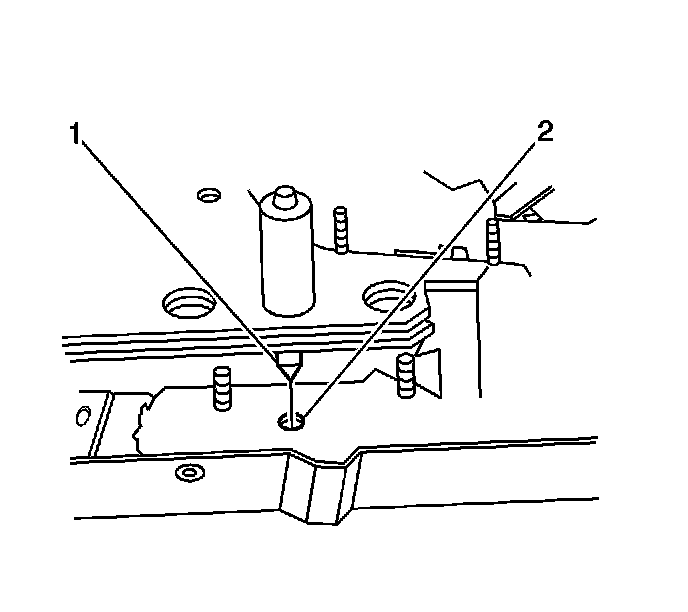 3. Position the folding top module to the vehicle and align the front locating pins (1) to the holes (2) in the B-pillars while lowering the module into place.